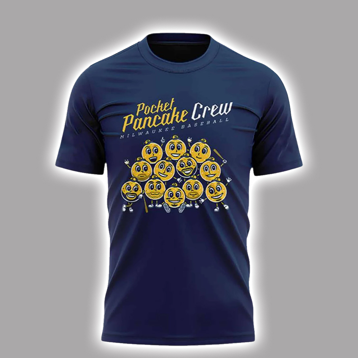 The Milwaukee Brewers Pocket Pancake Crew Shirt is a playful yet bold tribute to Milwaukee baseball culture, featuring a cheerful squad of pancake-faced characters that bring pure joy to the front design. With “Pocket Pancake Crew” boldly printed above the lineup of animated breakfast buddies, this shirt captures the heart of game-day fun and clubhouse camaraderie. The back ties it all together with sleek graphics, bat-and-ball icons, and a golden glove insignia that instantly connects to the spirit of the game. The smiling stack of pancakes represents more than just a breakfast pun it’s a symbol of team unity, energy, and community spirit that every fan can proudly wear.