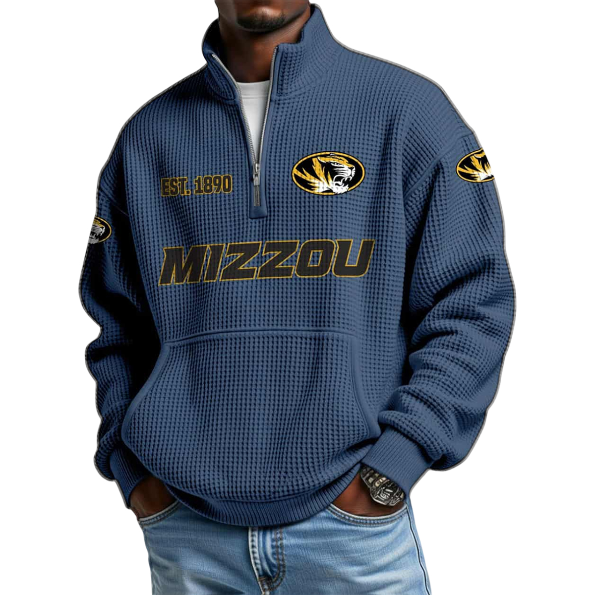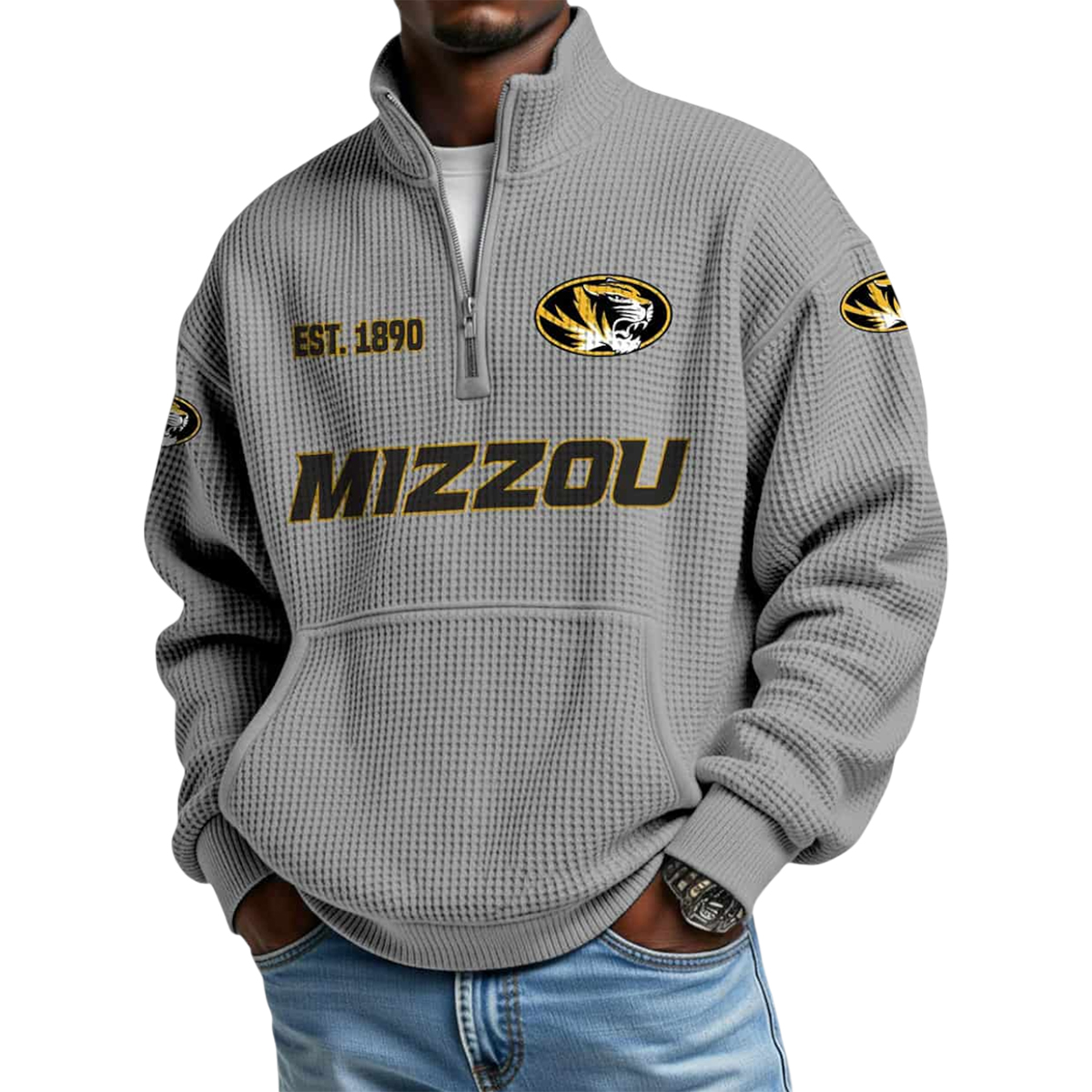 At first glance, the Missouri Est 1890 Waffle Stand Collar Half Zip Sweatshirt stands out with its textured waffle-knit surface, giving the fabric depth, structure, and visual interest. The charcoal-gray base is complemented by bold gold accents, creating a strong contrast that feels confident yet refined. Across the chest, the “MIZZOU” lettering is prominently displayed, while the “Est. 1890” detail highlights the year that marks the beginning of Missouri’s athletic and academic heritage.