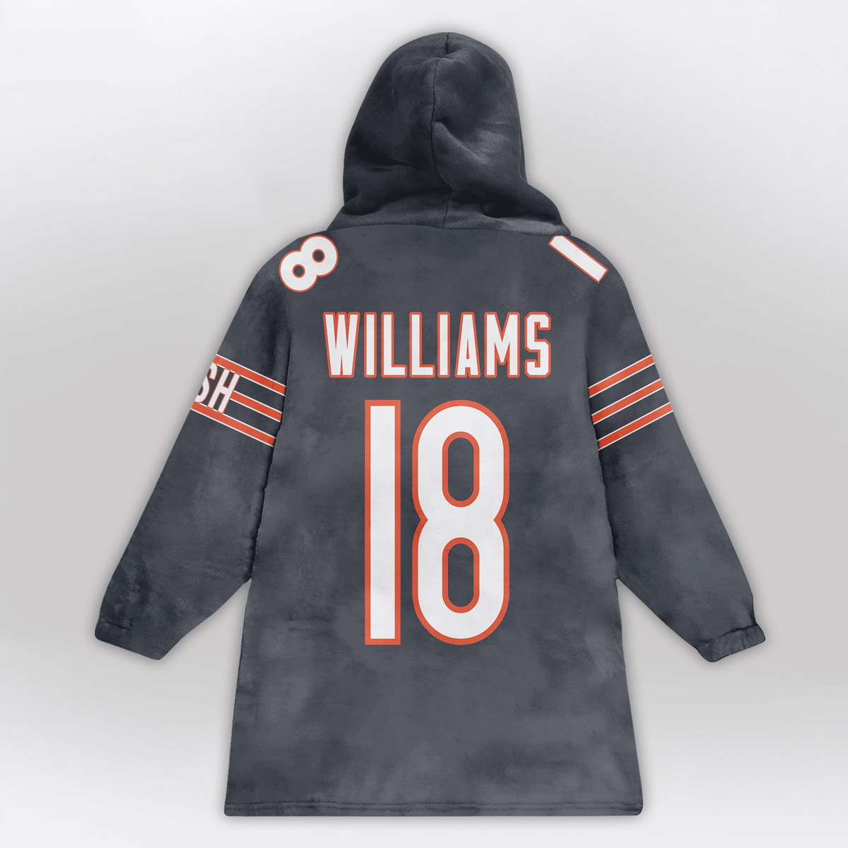 The Monsters of the Midway 18 Bears Football Unisex Blanket Hoodie stands out with its bold navy base, striking orange accents, and classic team aesthetic. The front showcases the powerful “Monsters of the Midway” lettering paired with a roaring bear head graphic, instantly evoking Chicago’s fierce defensive heritage. The sleeves feature orange and white stripes, while the back displays “WILLIAMS” and the number 18 in crisp block lettering symbols of leadership, energy, and the new generation carrying the team’s tradition forward.