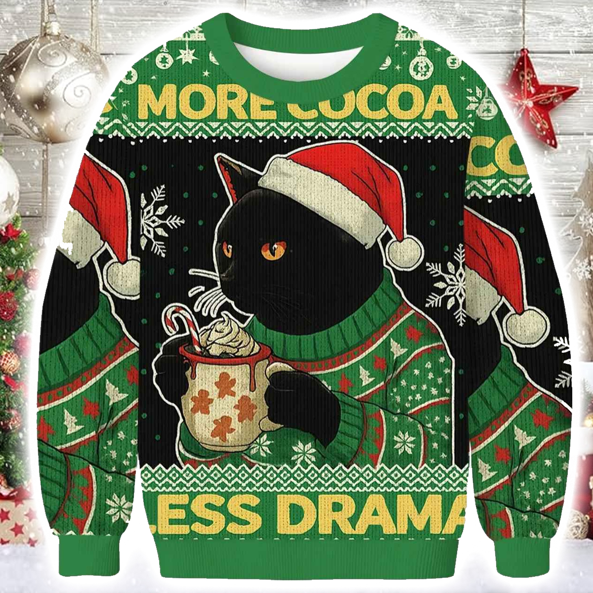 The design features a cool, unbothered black cat in a Santa hat, clutching a mug of whipped-cream-topped cocoa with candy cane flair. Surrounded by snowflakes, Christmas lights, and vintage-style text that reads “More Cocoa, Less Drama,” this sweater perfectly blends humor and holiday cheer. The combination of deep black, vibrant green, and festive red makes it stand out at every party without being loud about it.