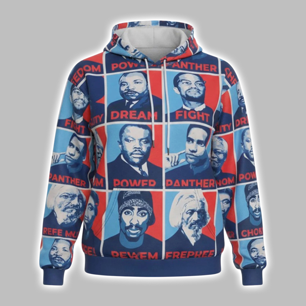 Visually, the hoodie stands out with a grid-style collage featuring illustrated portraits rendered in bold red, blue, and neutral tones. The design feels both retro and modern, echoing poster art while remaining clean and wearable. The typography is intentionally direct, reinforcing the themes without distraction. From the hood to the sleeves, the print wraps the garment in meaning, making every angle part of the story. The relaxed silhouette and classic hoodie structure make it easy to style, whether layered with streetwear staples or worn as a centerpiece on its own.
