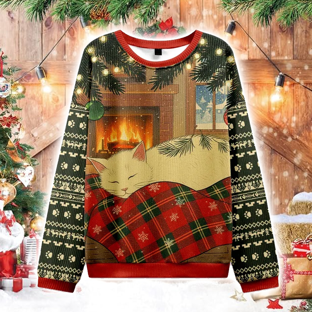 The Napping Cat Christmas Ugly Sweater features a heartwarming design that captures the essence of a peaceful holiday evening. At the center of the sweater is a serene white cat, curled up and sleeping soundly on a red plaid blanket, set against a warm backdrop of a glowing fireplace and softly falling snow outside a frosted window. Draped in pine branches and twinkling lights, this sweater feels like a warm hug wrapped in holiday magic.