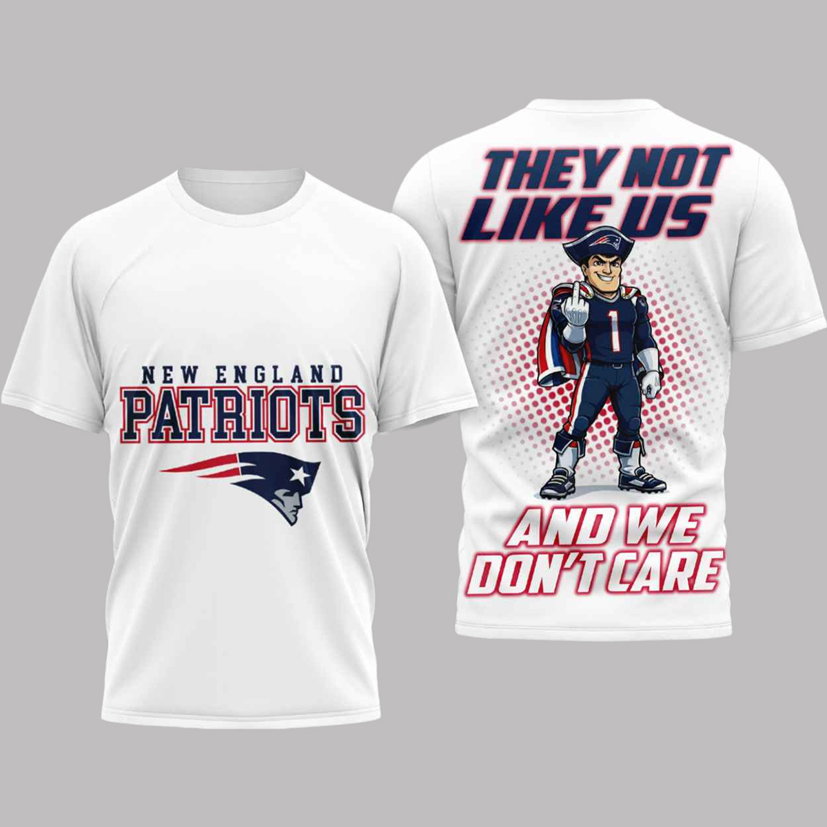 Visually, the shirt stands out with a clean white base that makes the graphics pop instantly. The front features strong New England Patriots lettering paired with a bold team emblem, creating a balanced and recognizable look. The back takes things further with a striking 3D-style illustration of a football character and the powerful phrase “They Not Like Us And We Don’t Care,” delivering attitude and confidence in equal measure. The layered dot-pattern background adds depth and motion, giving the shirt a modern, high-impact presence from every angle.