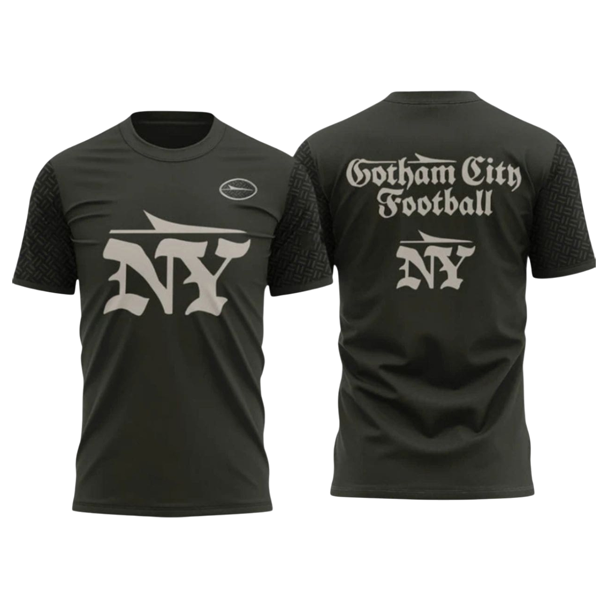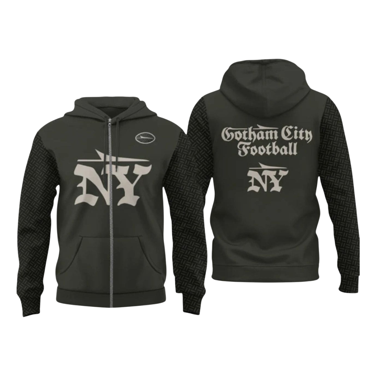 This hoodie features a deep charcoal tone paired with bold typography and a dramatic NY emblem across the chest. The sleeves carry a geometric black-on-black pattern that adds depth and texture, giving the entire silhouette a premium urban look. On the back, “Gotham City Football” appears in a sharp gothic font, sitting above a large NY graphic that ties the theme together.