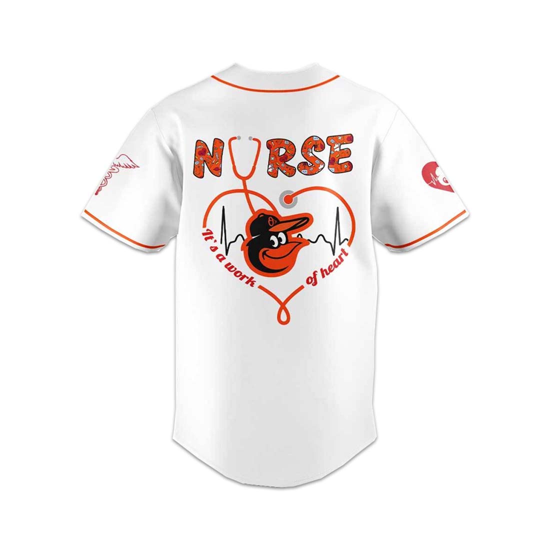 In terms of back side, the message gets bolder. “NURSE” is printed in a bold, cheerful font filled with orange and heart-shaped patterns, with a stethoscope looping into a heart that surrounds the Orioles bird head logo. Below it, the message reads: “It’s a work of heart” in order to remind that nursing is not just a job, but it comes from your heart and dedication. The sleeve logos feature the striking caduceus wings and heart icons.