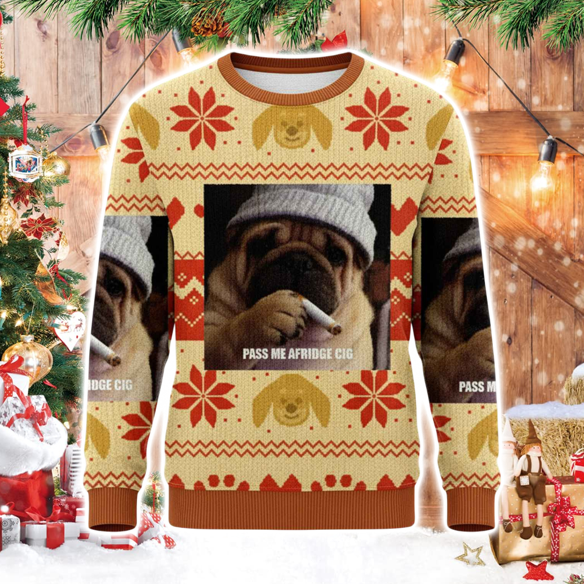 This sweater features one of the season’s most unforgettable visuals: a grumpy, wrinkly dog wearing a cozy winter beanie, holding what looks like a rolled cigarette, paired with the bold caption “PASS ME A FRIDGE CIG.” The meme-style image is framed with warm holiday tones: cream, gold, and red, arranged in traditional Christmas patterns like poinsettias, zigzag rows, and decorative icons. The floral motifs and stylized dog faces blend perfectly with the humorous central picture, creating a look that feels festive and unhinged in all the right ways. This design went viral in recent winters as meme culture fused with ugly sweater traditions, making it a trending outfit choice for holiday parties, office events, and social media posts.