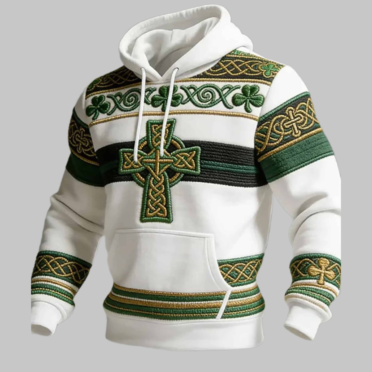 This hoodie draws inspiration from St. Patrick’s Day, a cultural celebration recognized for honoring Irish history, faith, and identity. The base color is a clean, soft white that allows the embroidered green and gold elements to take center stage. Across the chest, a large Celtic crucifix motif appears in rich green tones, carefully framed with interwoven knot patterns that symbolize eternity and connection.