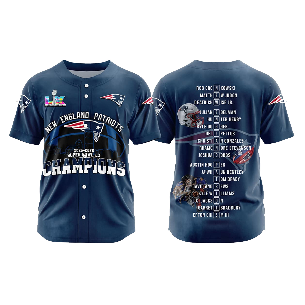 In terms of design and construction, the Patriots 2025 2026 SB LX Champions Jersey stands out with its deep navy tone, dynamic graphics, and bold championship iconography. The button-front baseball-style silhouette adds a unique twist, setting it apart from traditional football jerseys and giving it crossover appeal for casual wear. The fabric is smooth, breathable, and comfortable, making it suitable for game days, celebrations, or everyday outfits. High-contrast lettering and crisp graphics ensure that every detail remains sharp and eye-catching, even from a distance.