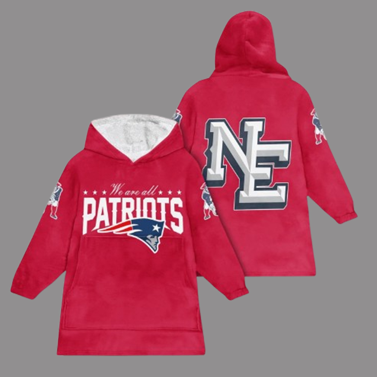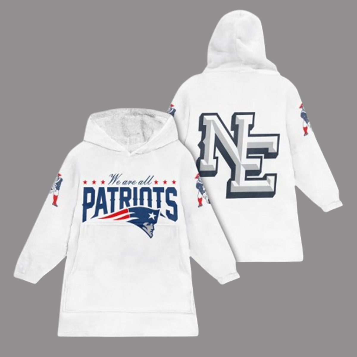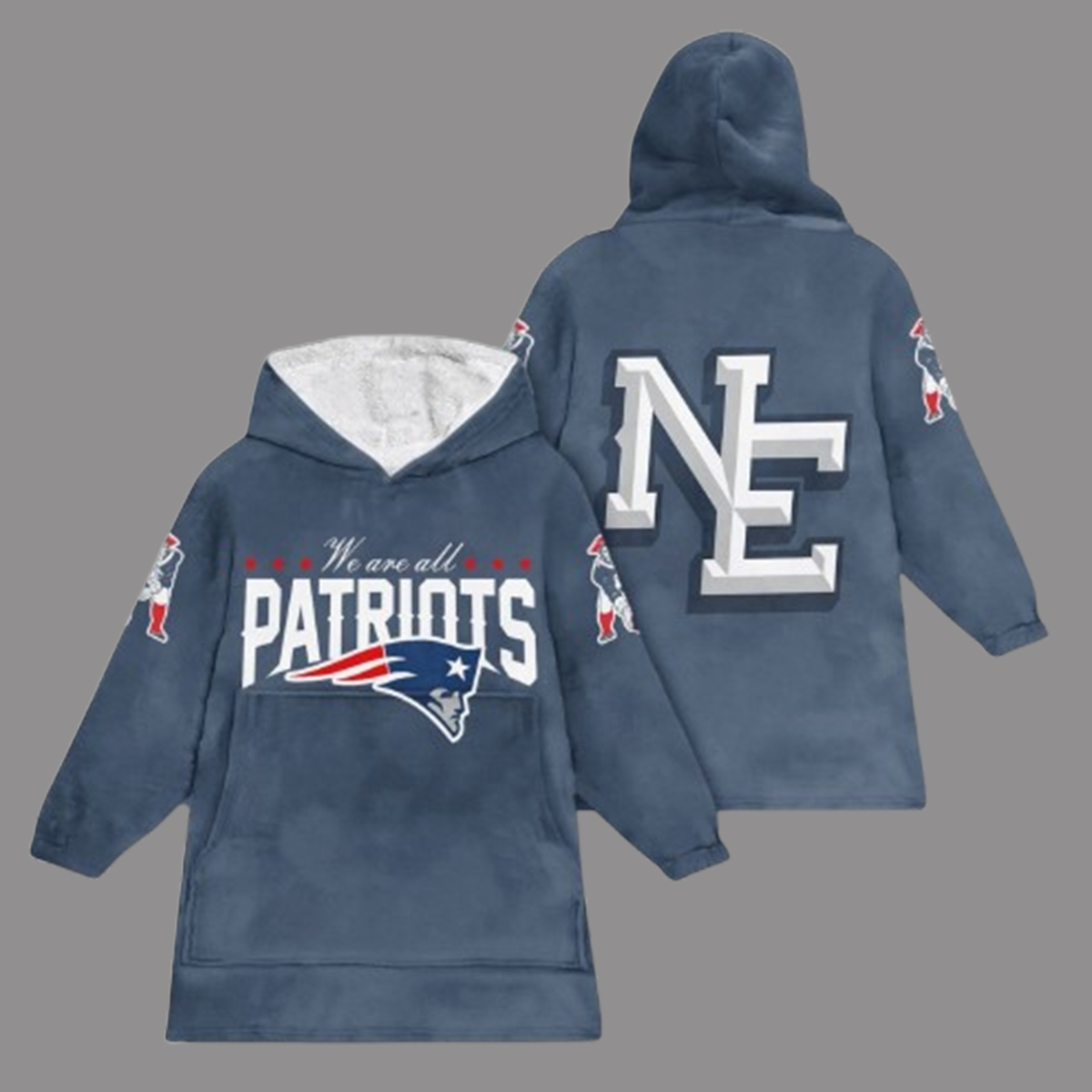 This blanket hoodie comes in a deep storm blue tone, creating a calm yet powerful base that highlights the graphics on both sides. The front features the phrase “We Are All Patriots” across the chest, paired with a classic team emblem that anchors the design in tradition. Subtle accent details add balance without overpowering the message, making the front clean, readable, and impactful.
