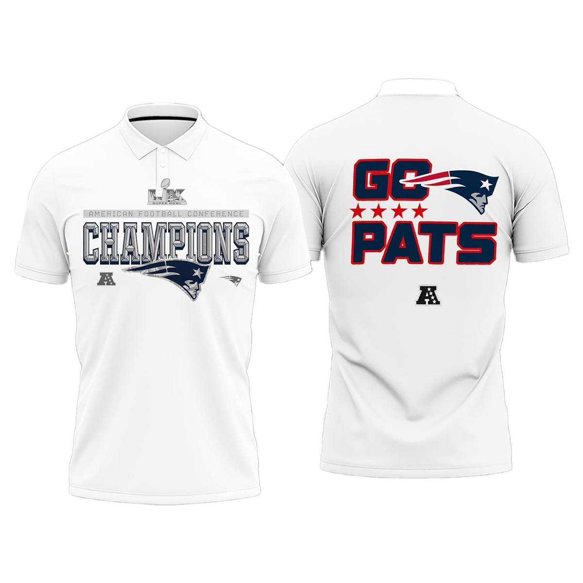 This design is closely tied to the AFC Championship moment that confirmed New England’s dominance during the season. After weeks of high-pressure matchups and disciplined performances, the team secured the conference title and earned its place at the top. The front of the polo features a clean “AFC Champions” graphic paired with subtle team identity, while the back delivers a bold “Go Pats” statement accented with stars and strong typography. Together, these elements turn a historic achievement into a wearable expression of pride and belief.