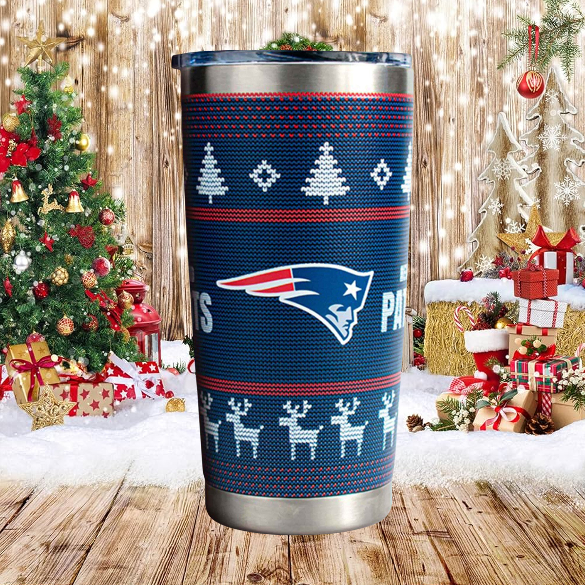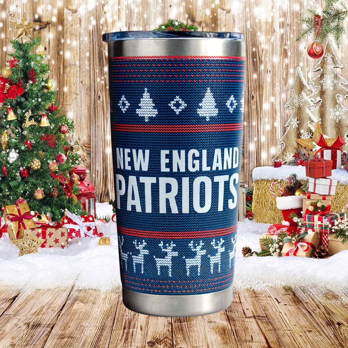 Featuring a vivid navy-blue knitted-sweater pattern, the tumbler is decorated with white pixel-style trees, diamond accents, and a charming row of reindeer—all arranged in a layout that feels straight out of a classic holiday sweater. The front displays the Patriots logo in crisp detail, while the back proudly reads NEW ENGLAND PATRIOTS in bold seasonal typography. The design wraps around the stainless-steel body, giving it a cheerful, winter-ready identity perfect for holiday gatherings or late-season matchups.