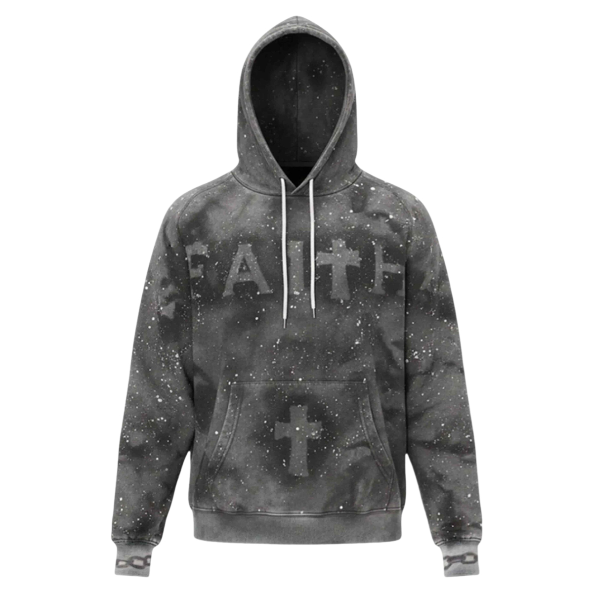 At first glance, the hoodie stands out through its atmospheric, stone-washed look. The dark, textured pattern creates a moody backdrop that immediately sets a reflective tone. Across the chest, the word “FAITH” appears in bold, understated lettering, accompanied by cross symbols that are integrated seamlessly into the design. Rather than overpowering the garment, these elements feel intentional and balanced, giving the hoodie a strong identity without relying on loud graphics. The subtle detailing continues throughout, making each angle visually interesting while still cohesive.