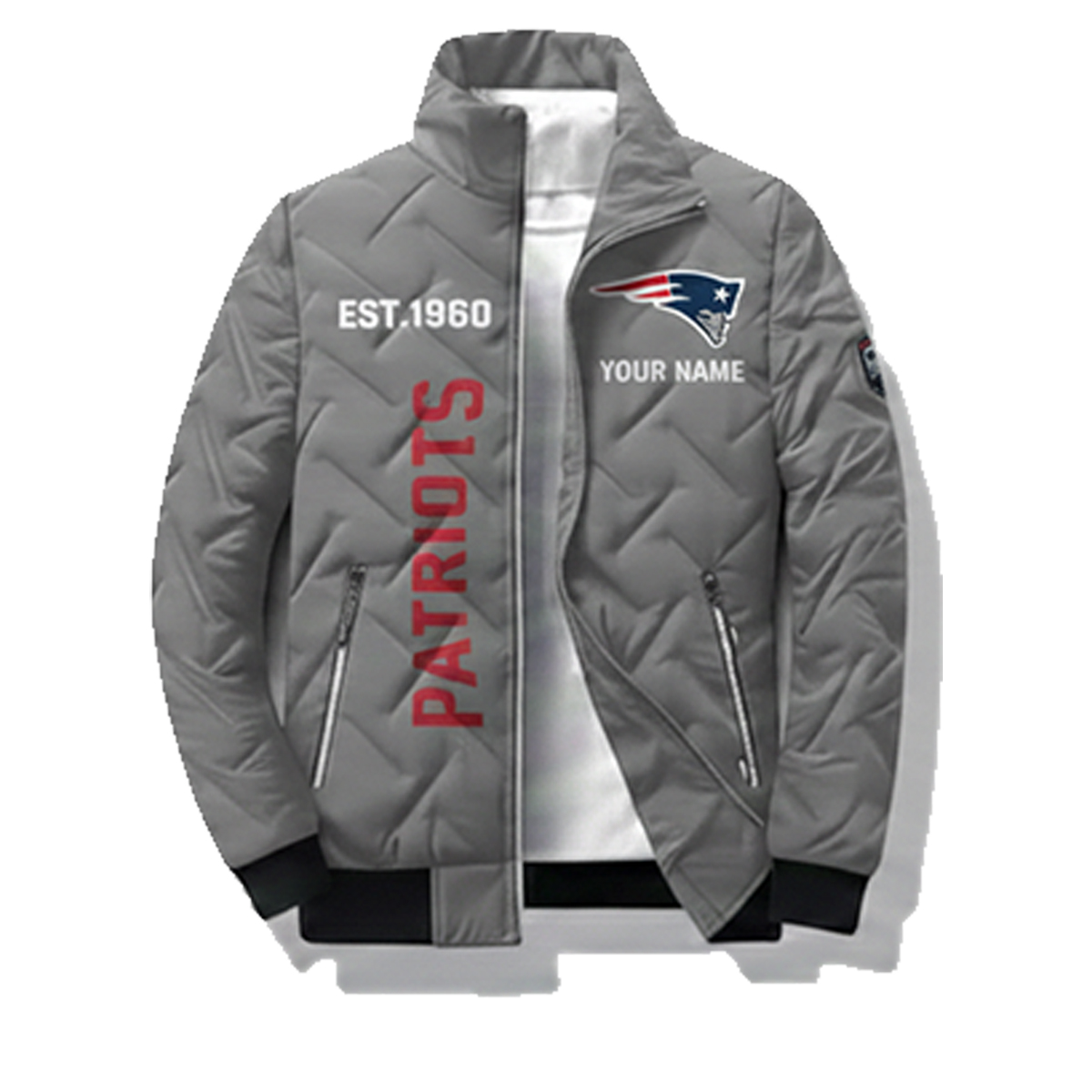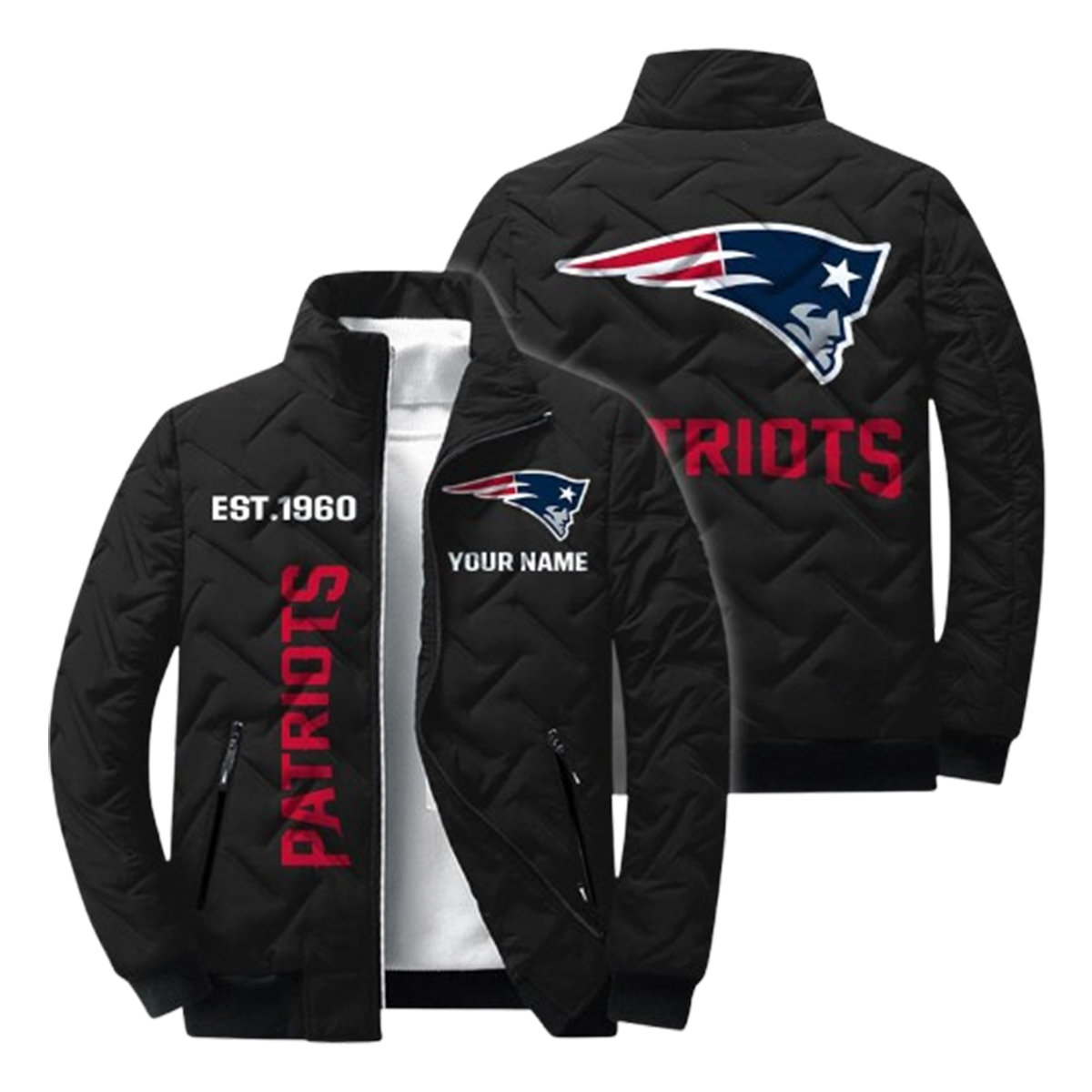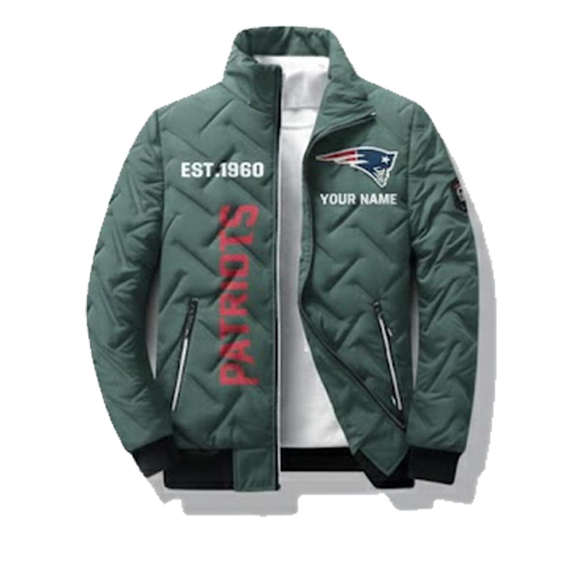 This jacket features a carefully engineered quilted construction that delivers reliable insulation while maintaining a sleek, structured look. The deep navy blue color creates a timeless winter aesthetic that is easy to pair with jeans, hoodies, or layered streetwear. On the back, the bold Patriot head graphic immediately commands attention, symbolizing resilience, leadership, and determination. The front design includes vertical “Patriots” lettering and “Est. 1960,” reinforcing the historical roots behind the jacket. A customizable name detail adds a personal element, transforming the jacket into a statement piece rather than ordinary outerwear. Ribbed cuffs and hem help trap warmth, while the high collar offers added protection against cold wind. Zippered side pockets provide practical storage for daily essentials, balancing comfort and functionality.