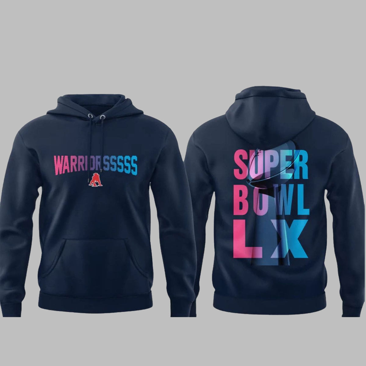 In terms of visual details, the hoodie is designed to stand out without feeling overdone. The front features the word “WARRIORSSSSS” in a striking gradient that immediately signals attitude and resilience, paired with a compact emblem beneath it for balance. On the back, the large “SUPER BOWL LX” graphic commands attention, layered with vivid colors that create depth and contrast against the dark base. The result is a clean yet powerful look that works whether you’re watching the game, heading out with friends, or adding a statement layer to a casual outfit.