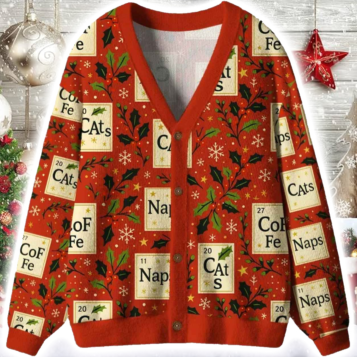 Celebrate the holidays with a clever twist of science, humor, and cozy warmth in the Periodic Table Funny Ugly Cardigan Sweater. Designed for anyone who loves caffeine, cats, and naps, this festive cardigan turns chemistry into comedy, proving that smart really is the new stylish this Christmas.