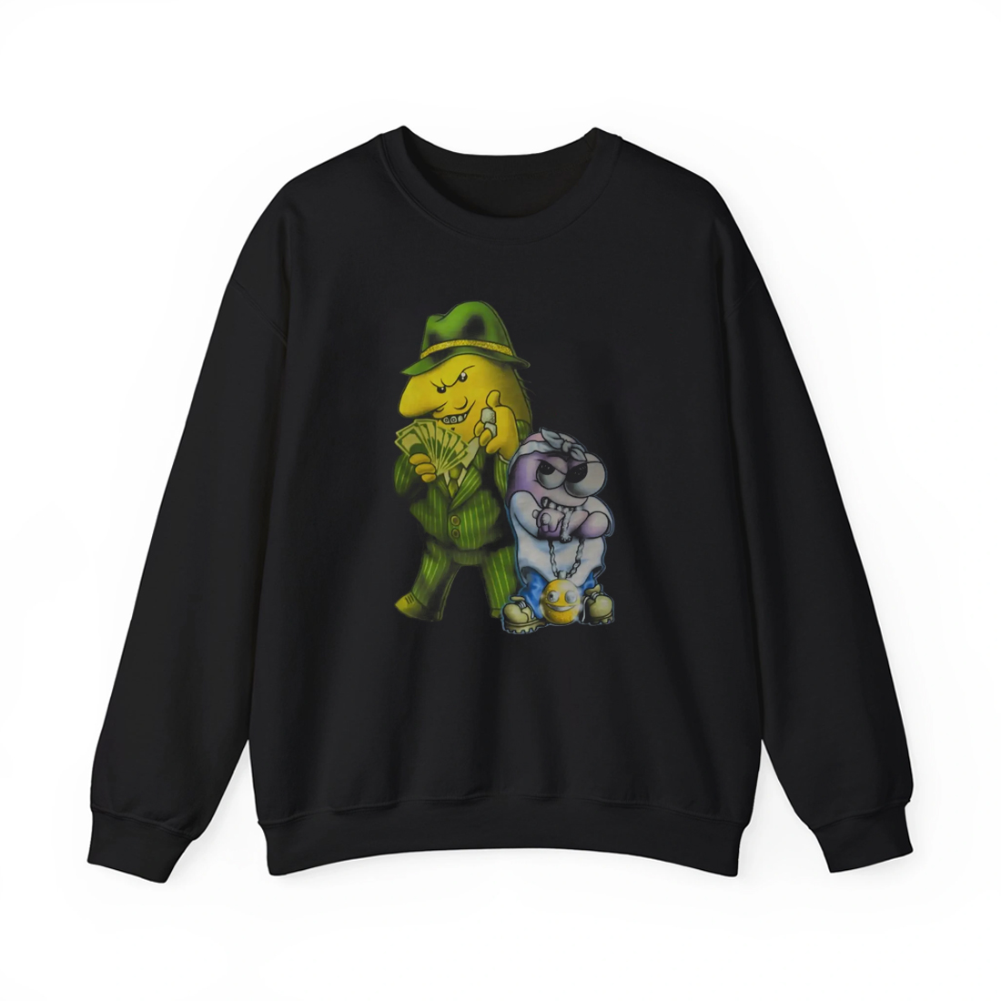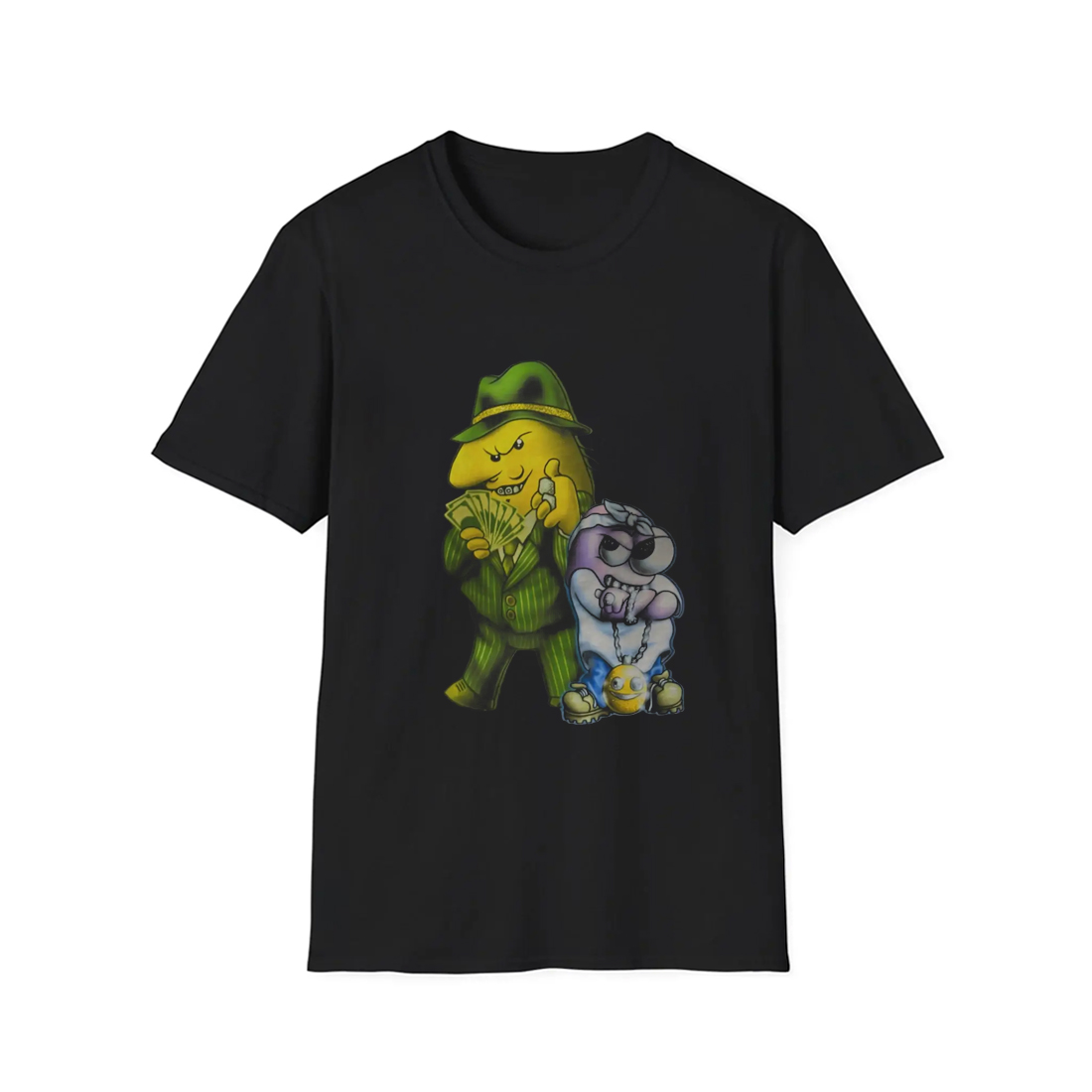 This black short-sleeve t-shirt features a striking airbrush-style design of two animated characters – Pim, a sharp-dressed yellow figure in a green pinstripe suit holding a stack of cash, and Charlie, a cool-toned sidekick in shades and chains. The vibrant, detailed artwork pops against the dark background, creating a bold look that’s impossible to ignore. The shirt is made from soft, breathable cotton for all-day comfort, and its classic fit suits both casual hangouts and standout streetwear moments.