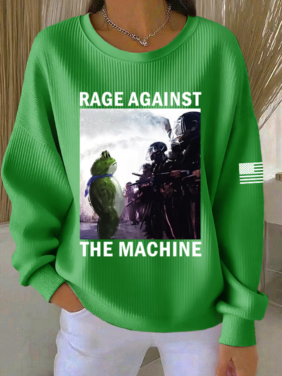 The Rage Against The Machine FDT Print Knit Crew Neck Long Sleeve Sweatshirt features a striking print that blends activism with culture. The front of the sweatshirt showcases a powerful graphic of a character in a standoff with military figures, accompanied by the bold statement RAGE AGAINST THE MACHINE in green letters. This graphic combines elements of protest and resistance, capturing the essence of rebellion against authority. The slogan adds an extra layer of meaning, creating a statement piece that echoes the sentiments of defiance and opposition.