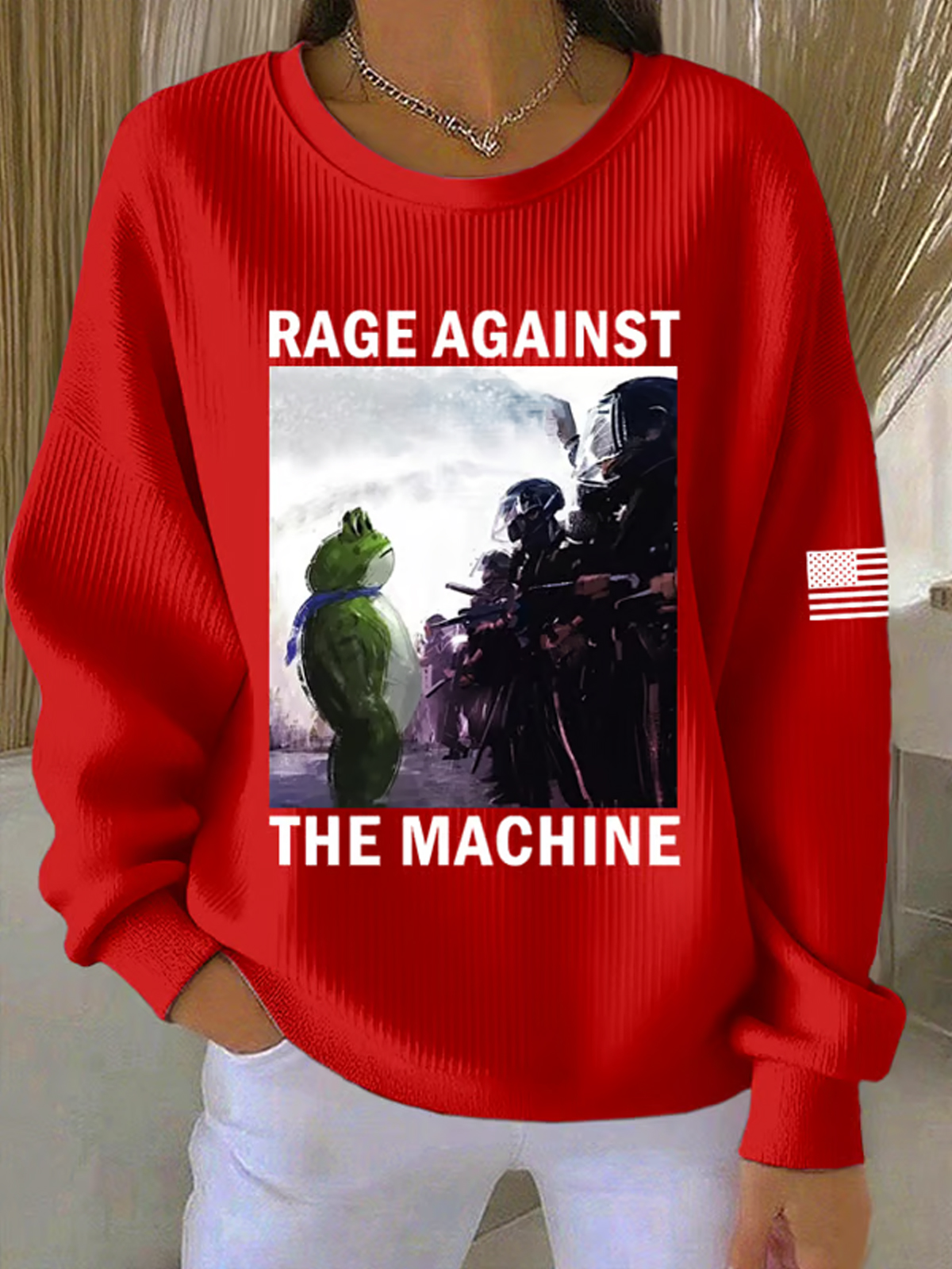 Show your defiance and stand strong with the Rage Against The Machine FDT Print Knit Crew Neck Long Sleeve Sweatshirt. This bold sweatshirt combines powerful imagery with a message of rebellion and freedom.