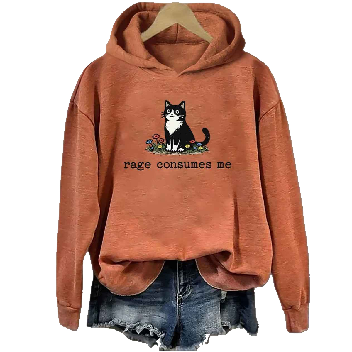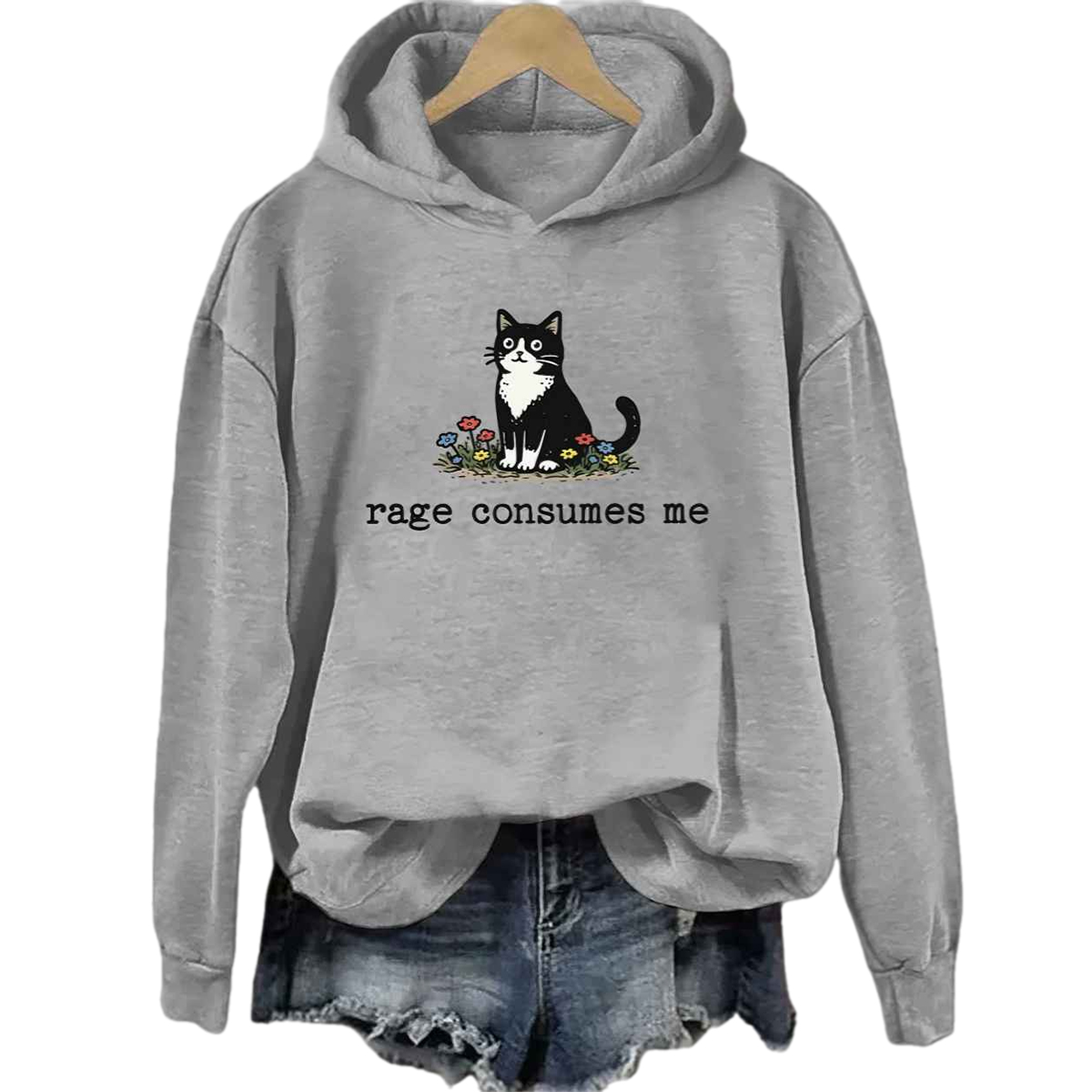 At the center of the hoodie is a small black-and-white cat sitting peacefully among colorful flowers, paired with the phrase “rage consumes me.” The artwork is intentionally minimal, using soft lines and muted tones to create a visual contradiction: a cute, almost wholesome character expressing an intense internal feeling. This contrast is what gives the design its power and makes it instantly recognizable to anyone who connects with ironic, emotion-driven fashion.