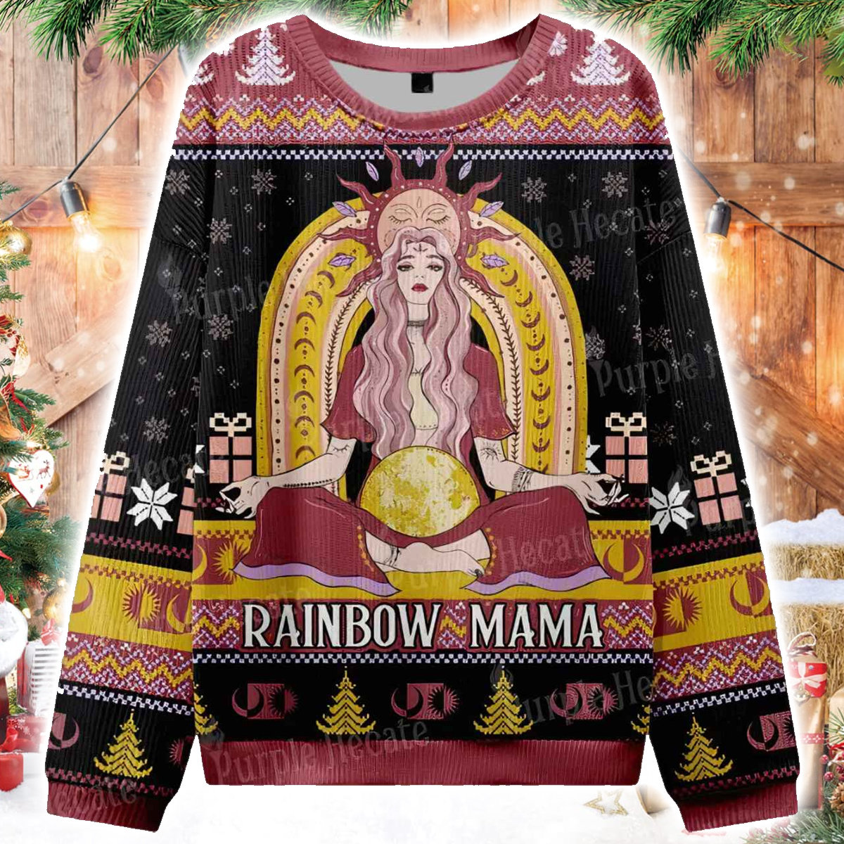 The Rainbow Mama Ugly Christmas Sweater is a visual hymn to motherhood, resilience, and creativity. At the center, a serene goddess-like figure sits cross-legged, cradling a glowing golden orb that symbolizes life, balance, and rebirth. Her flowing pink hair and soft gaze exude calm confidence, while the radiant yellow halo and sunburst behind her echo empowerment and divine energy. Surrounding the central figure are holiday touches — wrapped gifts, snowflakes, and geometric festive patterns in warm hues of burgundy, gold, and black — blending spirituality with seasonal cheer.