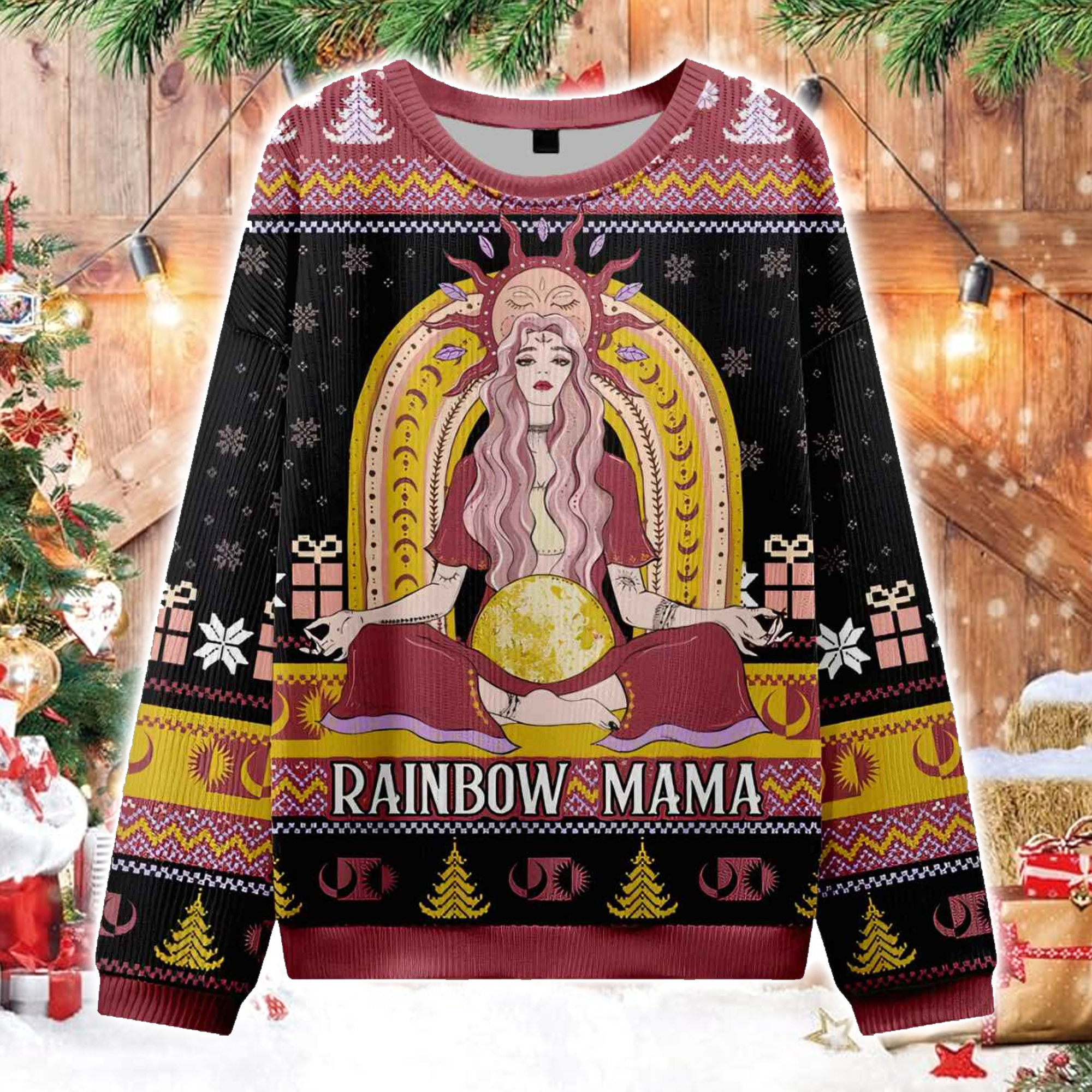 The Rainbow Mama Ugly Christmas Sweater features a mesmerizing central image: a serene goddess-like figure seated in meditation, surrounded by golden arches and cosmic symbols. Her long flowing hair glows with soft pink and lavender tones, while her hands cradle a shining golden orb which is the symbol of creation, balance, and maternal power. Above her head, the sun radiates warmth and enlightenment, while at her feet, the earth blooms in shades of red and gold.
