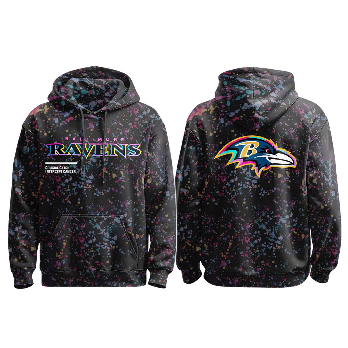 The Ravens Crucial Catch 2025 Hoodie is more than just a stylish way to support your team it’s a tribute to strength, unity, and awareness in the fight against cancer. Designed with a striking black base and vibrant splatter pattern in pink, blue, purple, and yellow tones, this hoodie immediately catches the eye. On the front, BALTIMORE RAVENS is displayed in bold, colorful text that reflects both team energy and individuality. .