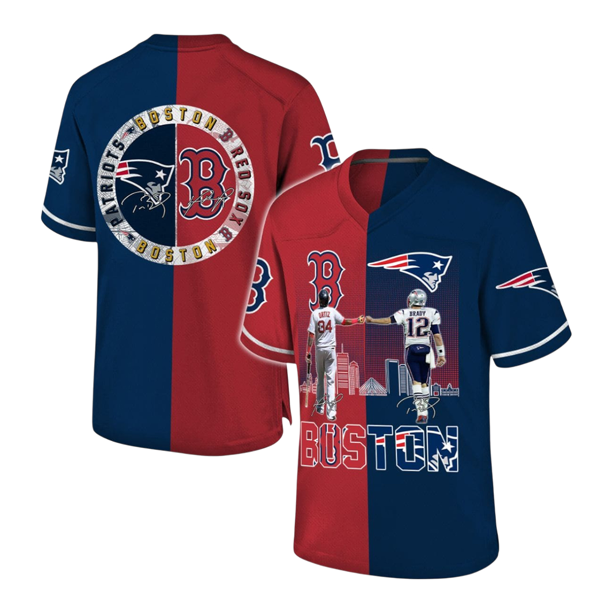 This jersey features a split-color layout symbolizing the unity between two powerhouse teams. The front showcases Ortiz in Red Sox red and Brady in Patriots navy, walking side-by-side toward a stylized Boston skyline, an image that instantly sparks emotion. The vivid “BOSTON” lettering beneath them ties the entire composition together. On the back, a circular emblem merges both team symbols with bold lettering, surrounded by intricate graphics that highlight Boston’s long-standing sports heritage. This design grew in popularity during commemorations and fan celebrations in 2024–2025, where supporters honored the lasting impact of these two legends.