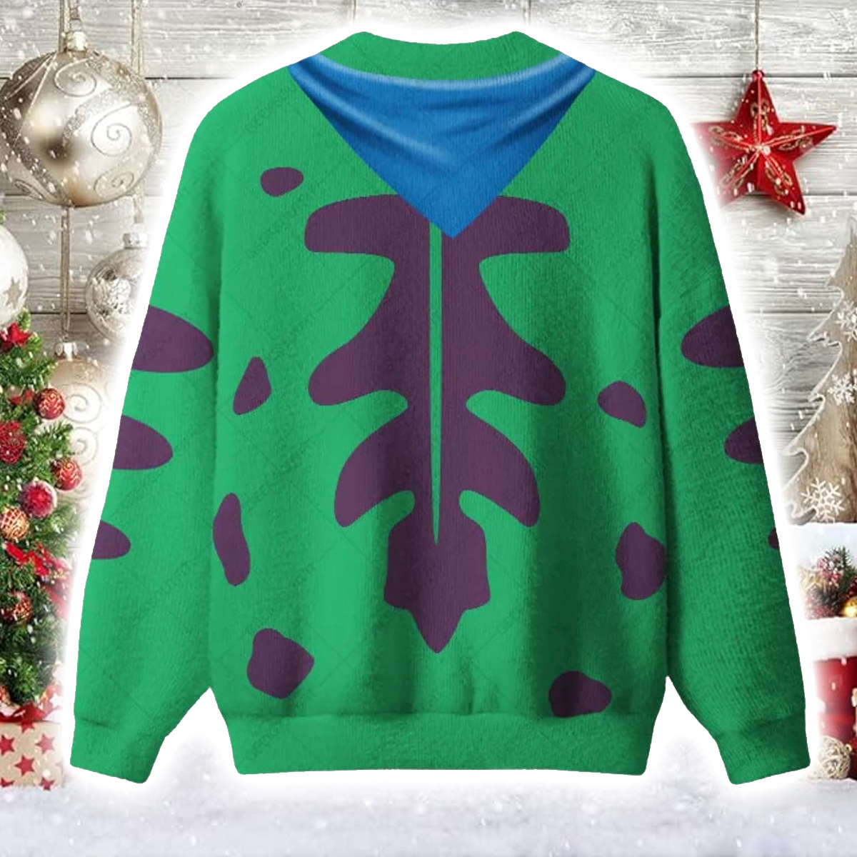 Inspired by the playful look of a frog suit costume, the Resist Frog Suit Ugly Christmas Sweater features a bold green-and-purple pattern with a large white belly and a blue necktie accent. The word “RESIST” printed across the chest adds a touch of defiance, a tongue-in-cheek nod to those who refuse to conform to boring holiday traditions. It’s the kind of piece that draws smiles, double-takes, and maybe even a few laughs from across the room.