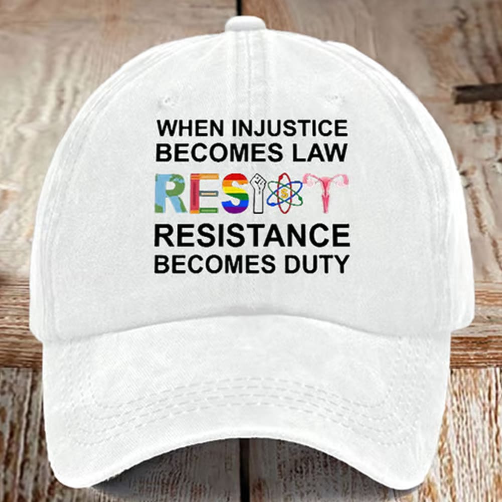 This dark denim-washed cap features bold white embroidery: “WHEN INJUSTICE BECOMES LAW, RESISTANCE BECOMES DUTY.” The word “RESIST” is brought to life with vibrant symbols like the rainbow flag for LGBTQ+ rights, a Black Power fist, a science atom and a uterus each letter representing a vital cause. It’s a powerful visual of intersectional activism in one impactful word. Designed with a relaxed fit, adjustable strap and distressed finish, this cap combines comfort and conviction perfect for rallies, daily wear or simply standing up in style.