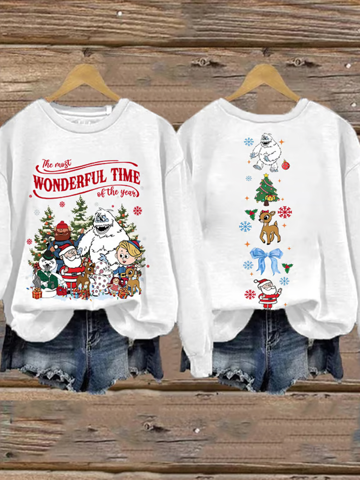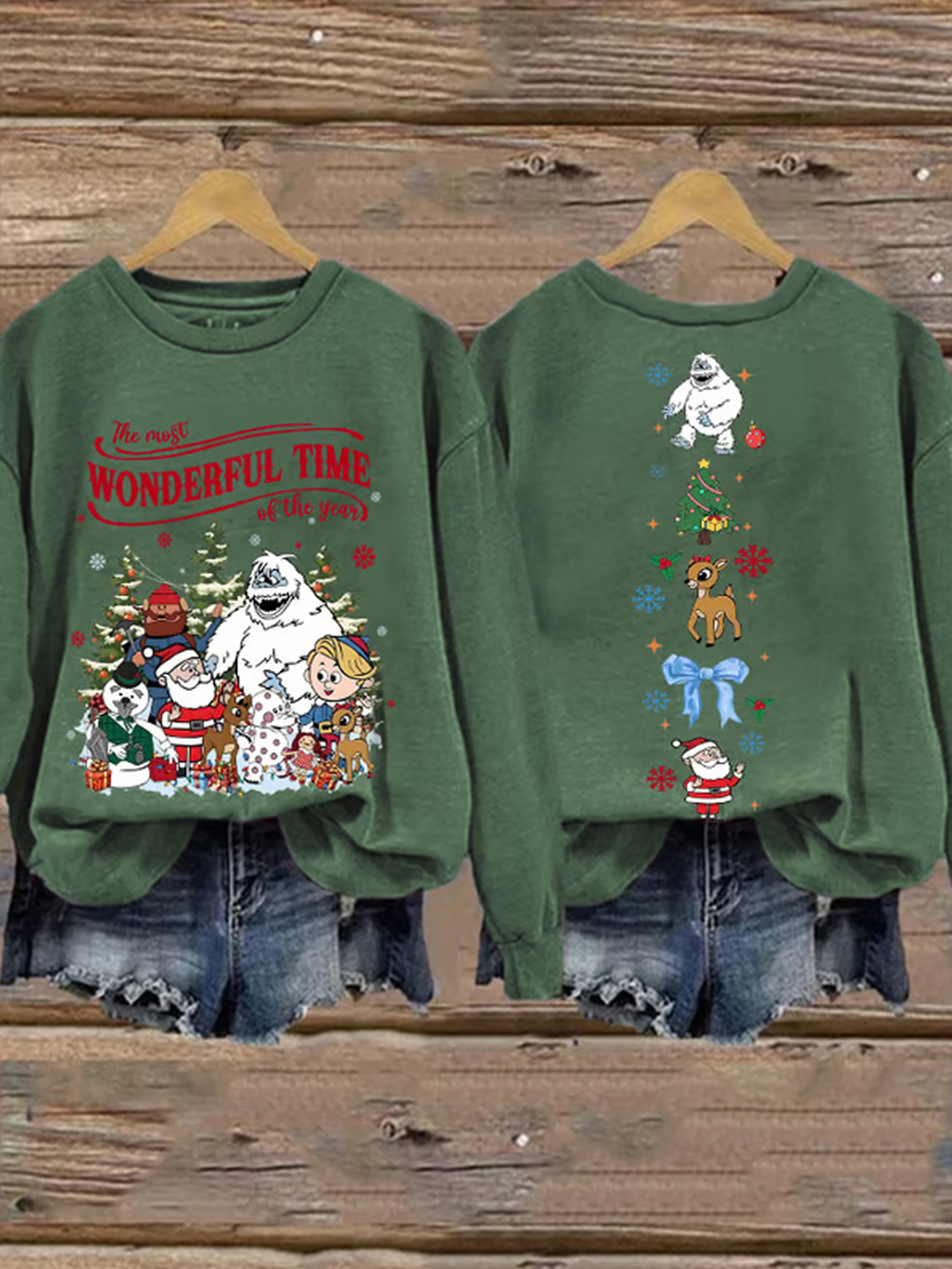 The Retro Christmas The Most Wonderful Time Of The Year Print Sweatshirt features a delightful design on both the front and back. The front showcases a joyful scene filled with beloved retro-style Christmas characters: Santa Claus, Rudolph the Red-Nosed Reindeer, a snowman, and the adorable Bumble from the classic holiday specials, all gathered around Christmas trees and presents. The phrase “The Most Wonderful Time of the Year” glows in festive red lettering above the artwork, completing the perfect old-school Christmas aesthetic. On the back, a charming vertical print continues the fun, with each character stacked playfully alongside snowflakes and ornaments, creating a design that’s as unique as it is heartwarming.
