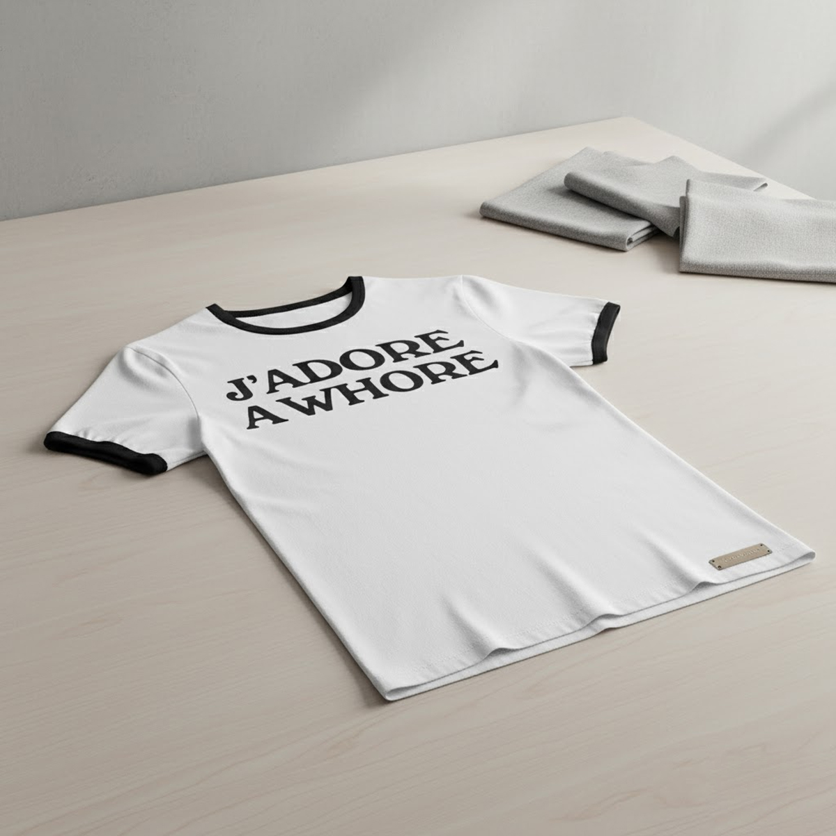 The Russell Tovey J’Adore A Whore Shirt blends humor, irony, and bold personality into one unforgettable look. With its striking black text against a clean white base, accented by black collar and sleeve trims, this shirt delivers vintage charm with a modern edge. The phrase, playfully styled in French-inspired typography, makes it a standout piece for those who dare to wear their confidence on their sleeve literally.