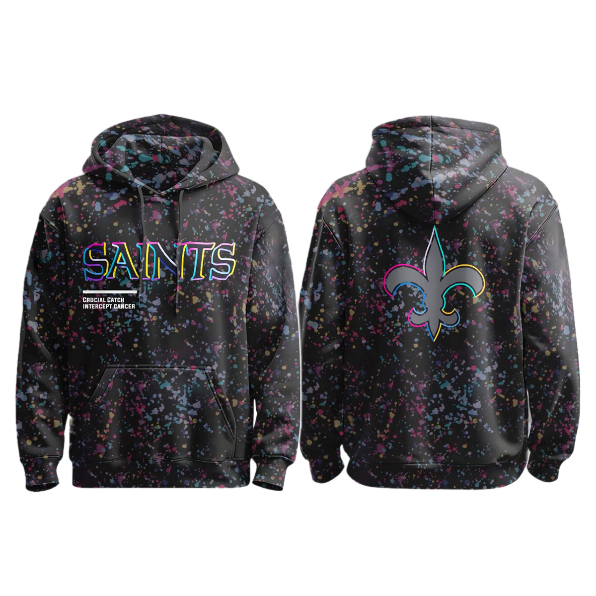 The Saints Crucial Catch 2025 Hoodie is designed on a sleek black background, featuring an immersive, all-over, multi-colored splatter pattern. This artistic design symbolizes the diverse range of cancers and the united community that works tirelessly to fight them. Across the chest, the bold SAINTS text is presented in a striking, multi-color gradient, positioned above the impactful message CRUCIAL CATCH INTERCEPT CANCER. This core message skillfully connects the most pivotal plays of the game the crucial catch, the interception with the life-saving mission to aggressively combat and prevent cancer.
