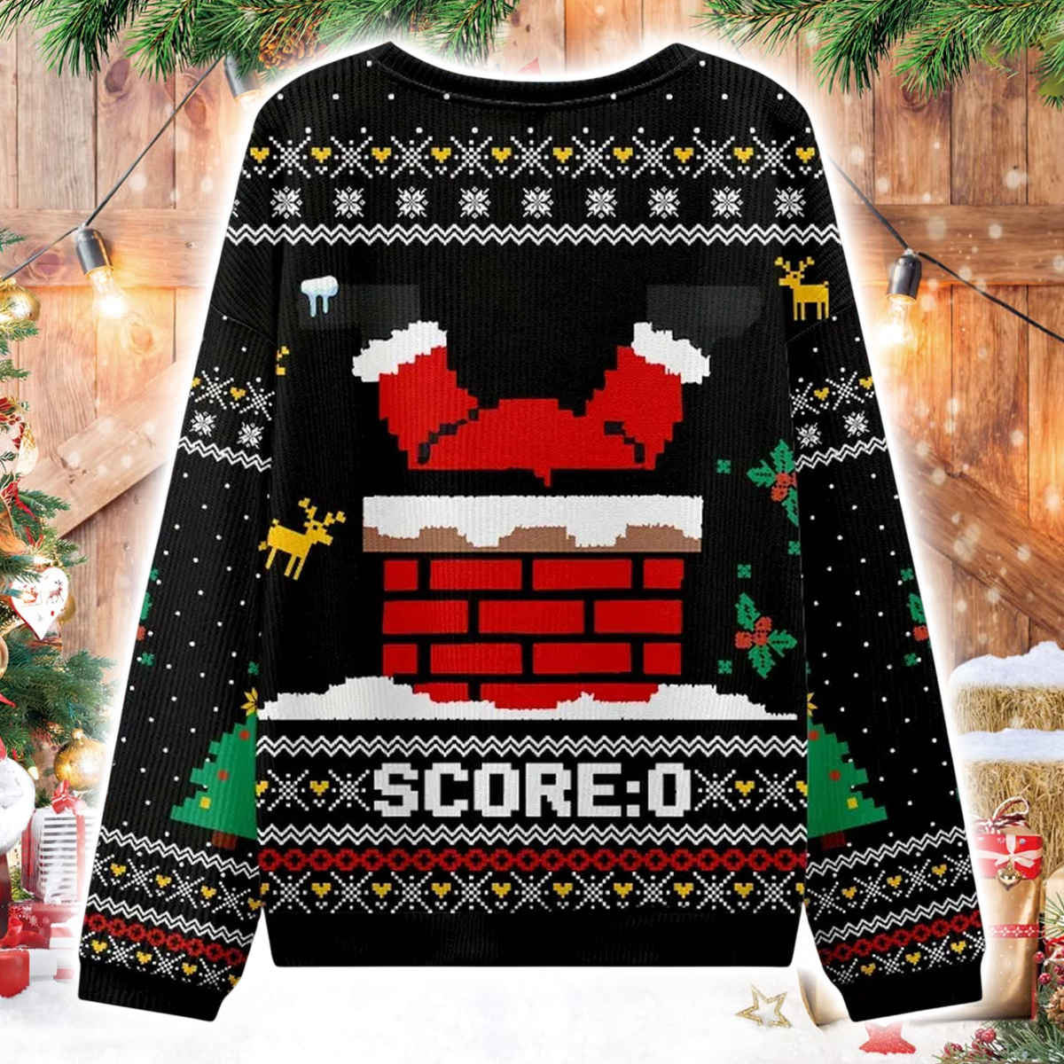 At the heart of the design, you’ll find Santa in a humorous predicamentlegs flailing as he tumbles down the chimney. Above him, the bold red “GAME OVER” text gives the sweater a playful, video game-inspired twist. Below, “SCORE 0” humorously highlights Santa’s not-so-successful rooftop landing, adding an extra layer of fun for gamers and holiday lovers alike.