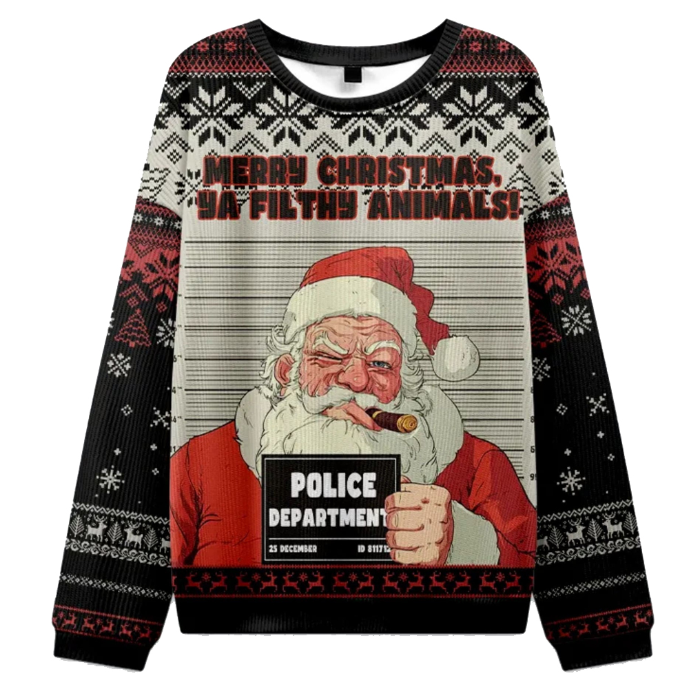 At the top, the mischievous text MERRY CHRISTMAS, YA FILTHY ANIMAL is written across a classic Fair Isle pattern. Below this, you’ll find a gritty mugshot style illustration of Santa Claus. He’s scowling, holding a POLICE DEPARTMENT sign, and defiantly puffing on a large cigar. The back of the sweater keeps it simple with the phrase Merry Christmas and a continuation of the Fair Isle and reindeer patterns.