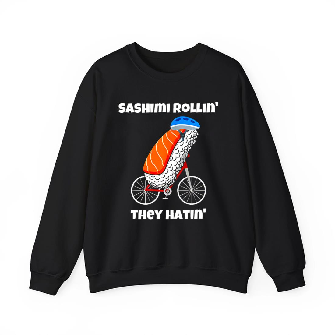 The design features an eye-catching cartoon of a sashimi nigiri—complete with salmon top and rice base—riding a bicycle. It even wears a blue helmet for safety, because this fish knows how to roll responsibly. Above and below the illustration is the viral-inspired phrase: Sashimi Rollin’ They Hatin’, turning every stroll into a punchline.