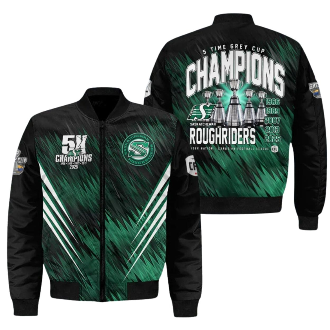 This bomber jacket draws inspiration from the Roughriders’ unforgettable Grey Cup victory in 2025, a season defined by resilience, unity, and belief. The front design features sharp geometric striping layered with deep green tones, creating motion and intensity that reflect the energy of the championship run. A prominent chest emblem highlights the team identity alongside “5X Champions” wording, immediately signaling legacy and achievement.