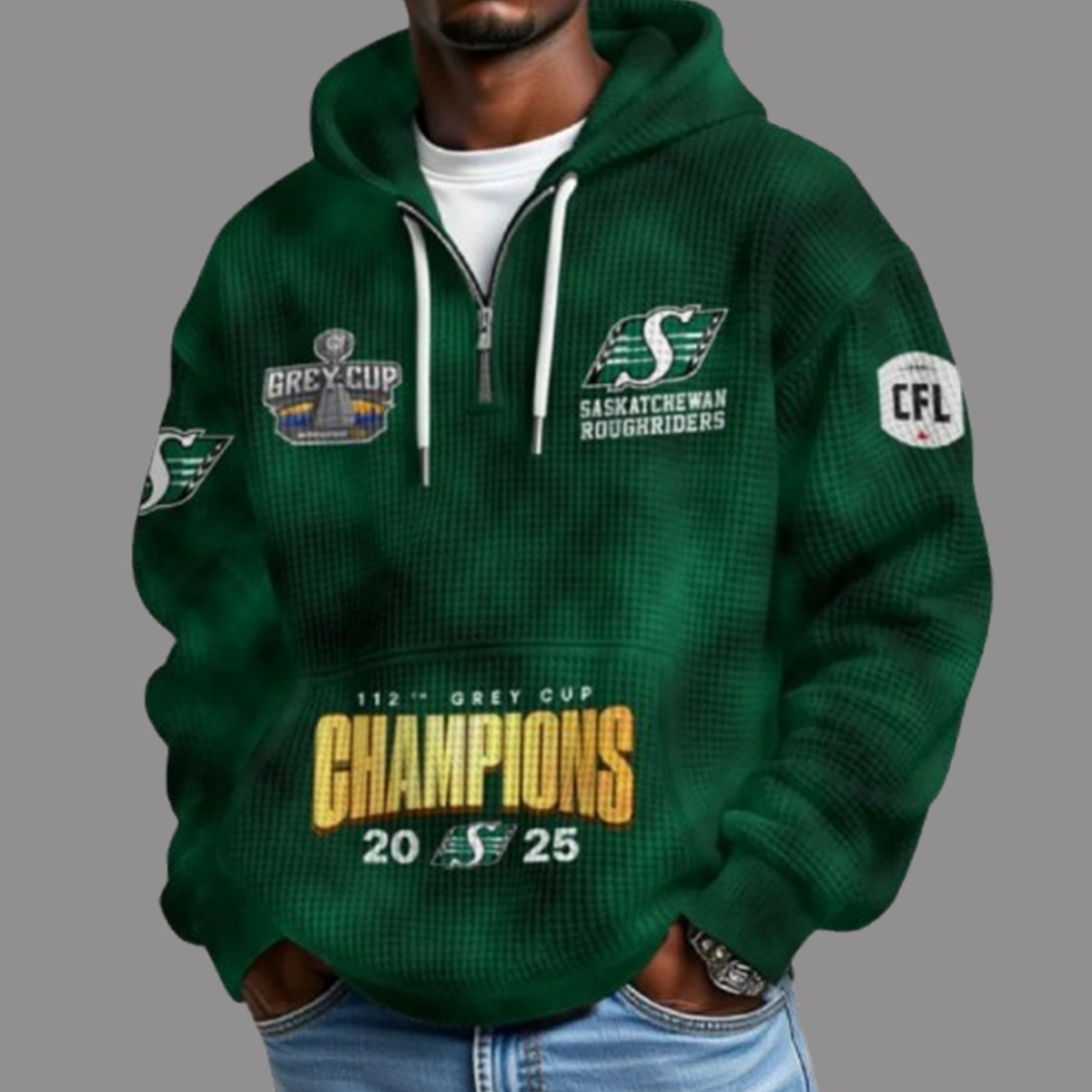 The Saskatchewan Roughriders 2025 Grey Cup Champions Waffle Hoodie captures the emotion of a title run that brought an entire fanbase together. From kickoff to the final whistle, this hoodie reflects resilience, unity, and the unmistakable feeling of watching your team rise when it mattered most.