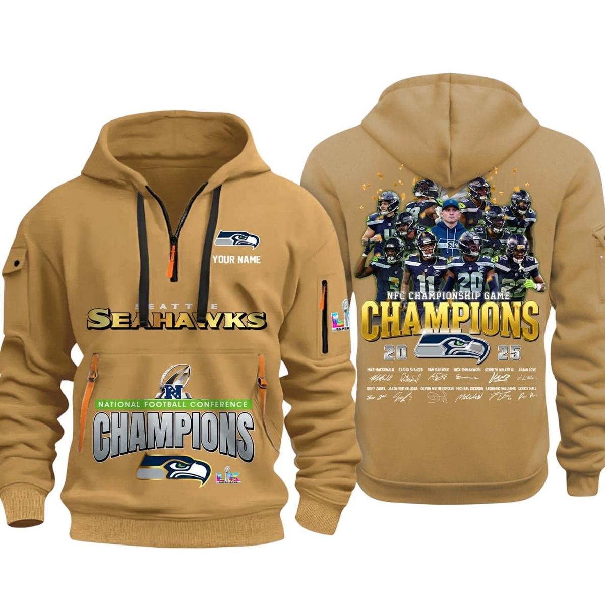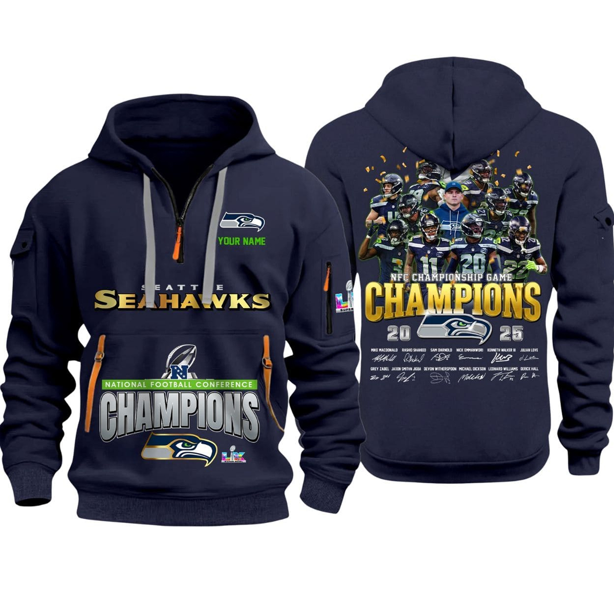 Designed for fans who love both performance and storytelling, the Seahawks 2025 NFC Championship Game Signature Quarter Zip Hoodie features bold graphics and key details that highlight Seattle’s big moment. On the front, the classic Seahawks wordmark stands at center, paired with room for personalization so you can add your name and make it uniquely yours. Below the chest, “NFC Champions” text celebrates the team’s achievement on January 25, 2026, when they defeated the Los Angeles Rams 31-27 to secure the conference title in a game filled with memorable plays and clutch performances.