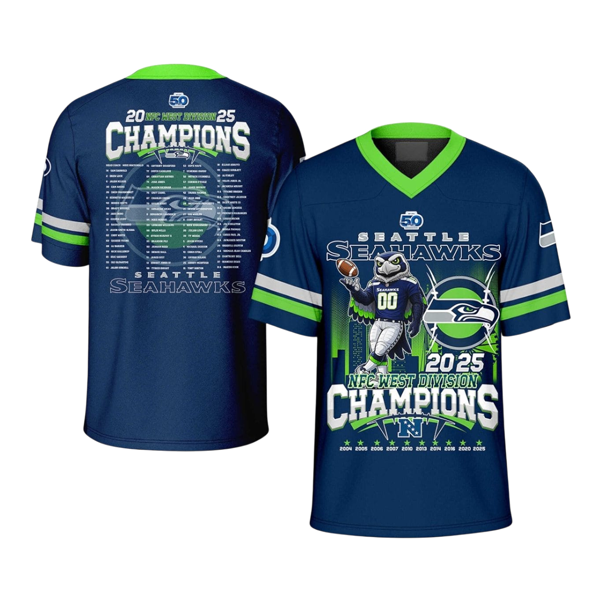 The front design features bold championship lettering layered over a dynamic graphic composition, highlighted by deep navy tones and sharp green accents. A powerful illustrated figure in action anchors the design, symbolizing leadership and momentum throughout the season. The “2025 NFC West Division Champions” text is prominently displayed, ensuring the achievement is impossible to miss. On the back, a detailed roster-style layout lists the names that defined the journey, arranged within a clean, structured graphic that balances detail with readability.