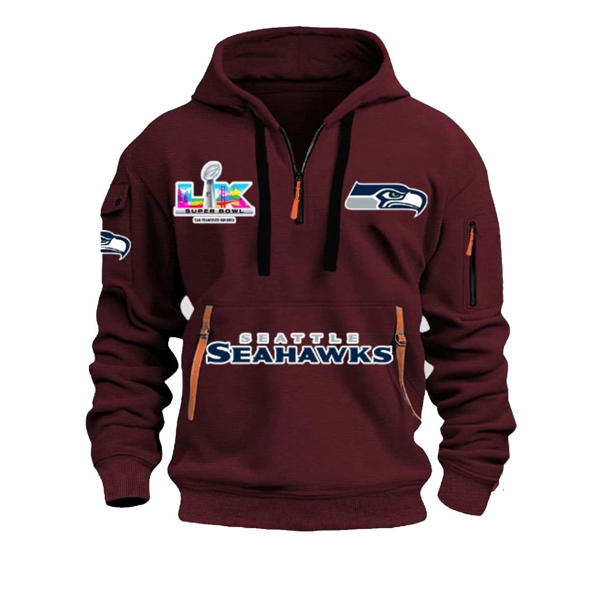 This hoodie features a deep maroon base that immediately sets it apart from typical fan apparel, offering a bold and refined alternative while still honoring Seahawks identity. The quarter-zip neckline adds versatility and structure, allowing you to adjust comfort and styling with ease. Across the chest, the “Seattle Seahawks” lettering is placed cleanly and confidently, reinforced by recognizable team graphics that bring balance to the design.