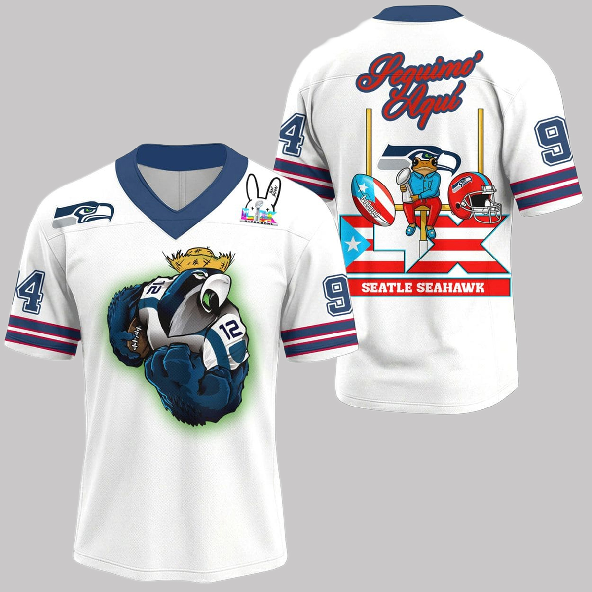 Turning to the back, the jersey tells an even richer story. A large star graphic filled with red, white, and blue elements anchors the design, accompanied by the text “Benito Bowl LX” and “Seattle Seahawk.” A cartoon-style football character wearing a helmet and holding a microphone adds a humorous, almost retro feel, referencing the celebratory atmosphere often associated with bowl-style showdowns. This combination of illustration, typography, and symbolism makes the jersey feel like a wearable poster commemorating a memorable football moment rather than just another piece of apparel.