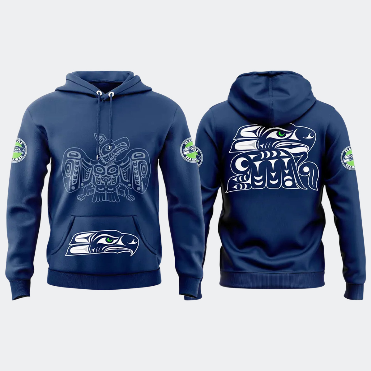 The Seahawks Indigenous Peoples’ Day Hoodie 2025 features a stunning navy base that serves as the perfect canvas for its bold artwork. On the front, a beautifully rendered Indigenous totem eagle spreads its wings, a symbol of strength, wisdom, and protection. Below, the iconic hawk head is reimagined through traditional formline art, its piercing green eye capturing the fierce energy of the Pacific wind. The back mirrors this cultural fusion with an intricate tribal motif, blending heritage and motion in one unified design. Sleeve patches featuring the team colors complete the look, emphasizing the connection between community pride and cultural respect.