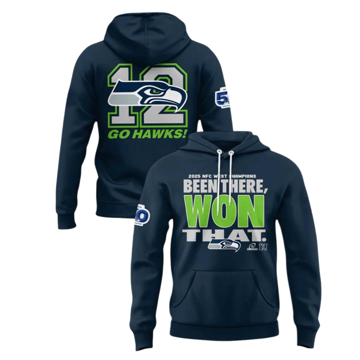 From the very first line, the Seahawks NFC West Champions 12 Go Hawks Hoodie 2025 signals confidence. The phrase “Been There, Won That” printed on the front speaks directly to fans who have seen this story unfold before and know what it takes to finish on top. This hoodie reflects the defining 2025 moment when Seattle secured the West crown, reaffirming its place as a powerhouse and rewarding the loyalty of those who stood behind the team all season long.
