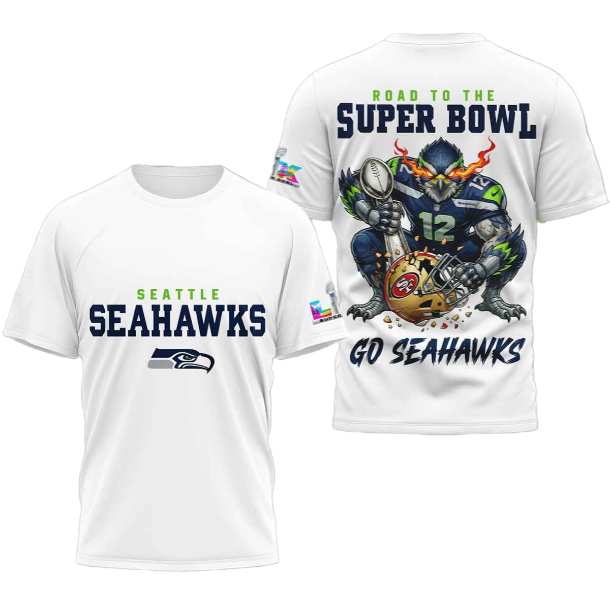 The Seahawks Road To SB 3D Shirt features a clean white base that makes the artwork stand out instantly. The front keeps things sharp and minimal with bold “Seattle Seahawks” text and a centered team emblem, creating a strong, confident first impression.