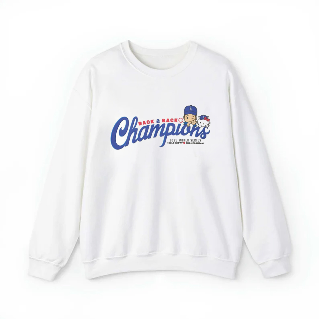 The Shohei Ohtani Hello Kitty Dodgers Shirt features a fun and vibrant graphic design that celebrates the 2025 World Series victory with the playful slogan Back 2 Back Champions. The shirt showcases cartoon versions of Shohei Ohtani and Hello Kitty side-by-side, both sporting Dodgers caps in a colorful, cheerful style. Printed on a high-quality white cotton tee, this shirt is lightweight, breathable, and comfortable for everyday wear. The bold blue and red text contrasts perfectly against the crisp white background, making the design pop with personality.