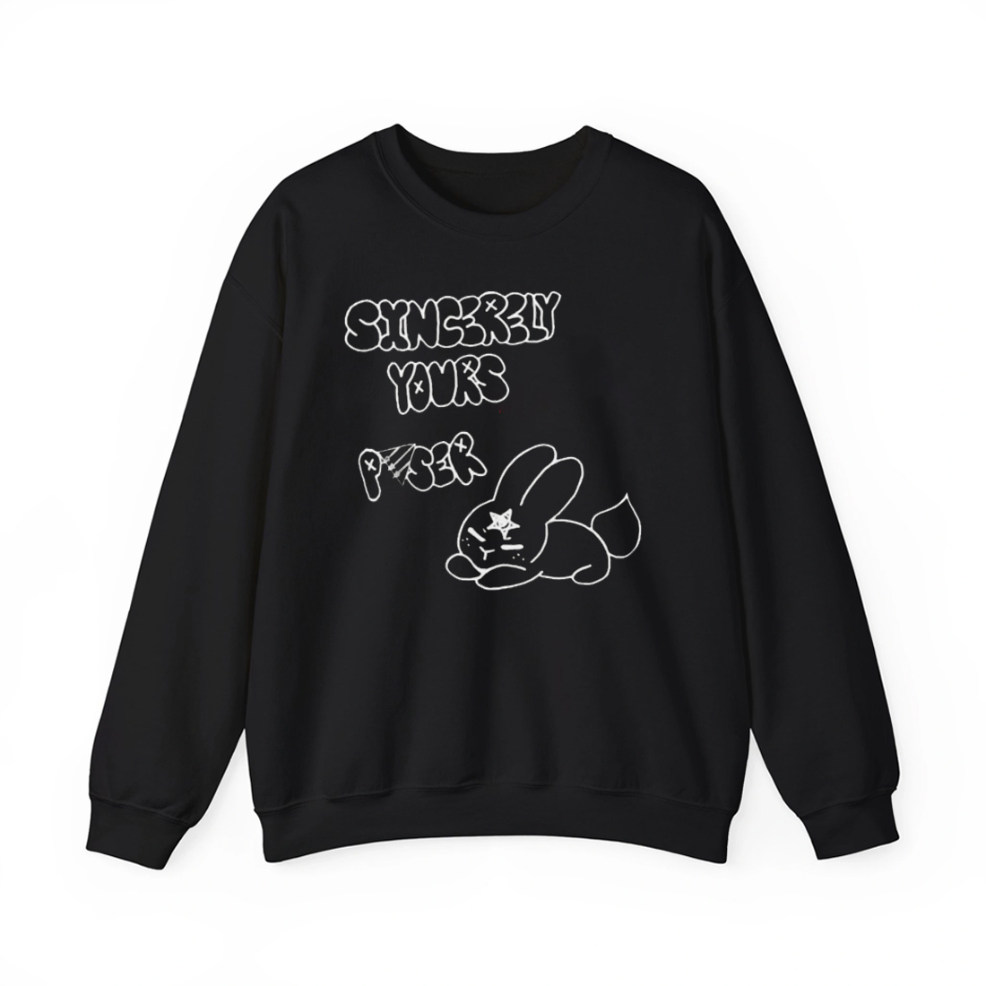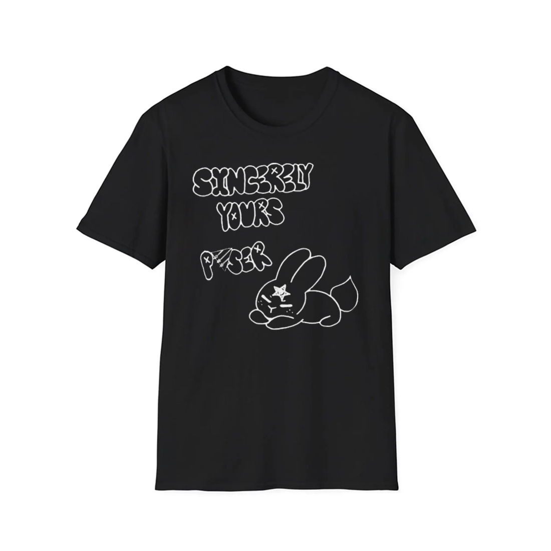 This black t-shirt features a distinctive, hand-drawn white graphic that channels a raw, rebellious energy often seen in underground art and music scenes. The design centers on a cartoon bunny, depicted with a slightly distressed, punk-rock aesthetic, including a star graphic over one eye, lying in a defiant pose. Above the bunny, the text reads, SINCERELY YOURS, followed by the provocative word, P*SER, written in a rough, spray-painted style font. The overall look is gritty yet charming, deliberately blurring the lines between cute and edgy, authentic and performative. The juxtaposition of the formal sign-off Sincerely Yours with the accusation Poser creates a darkly humorous and self-referential commentary on identity and belonging in subcultures.