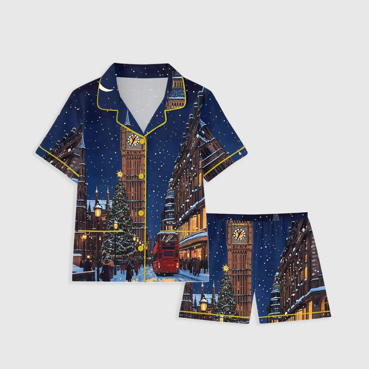 This pajama set is a love letter to Christmas in the city. Against a deep navy blue background, the design features a snowy London street scene with the famous Big Ben clock tower, a glowing Christmas tree, and classic red buses surrounded by warm golden lights. Every detail evokes that cozy, nostalgic feeling of walking through London’s frosty streets as the city sparkles in December. Crafted from breathable, soft cotton, the pajama set ensures all-night comfort and a relaxed fit, perfect for sipping hot cocoa, watching your favorite holiday films, or wrapping gifts by the fireplace. The short-sleeve top features yellow piping and matching buttons, while the elastic waistband shorts promise freedom and ease of movement.