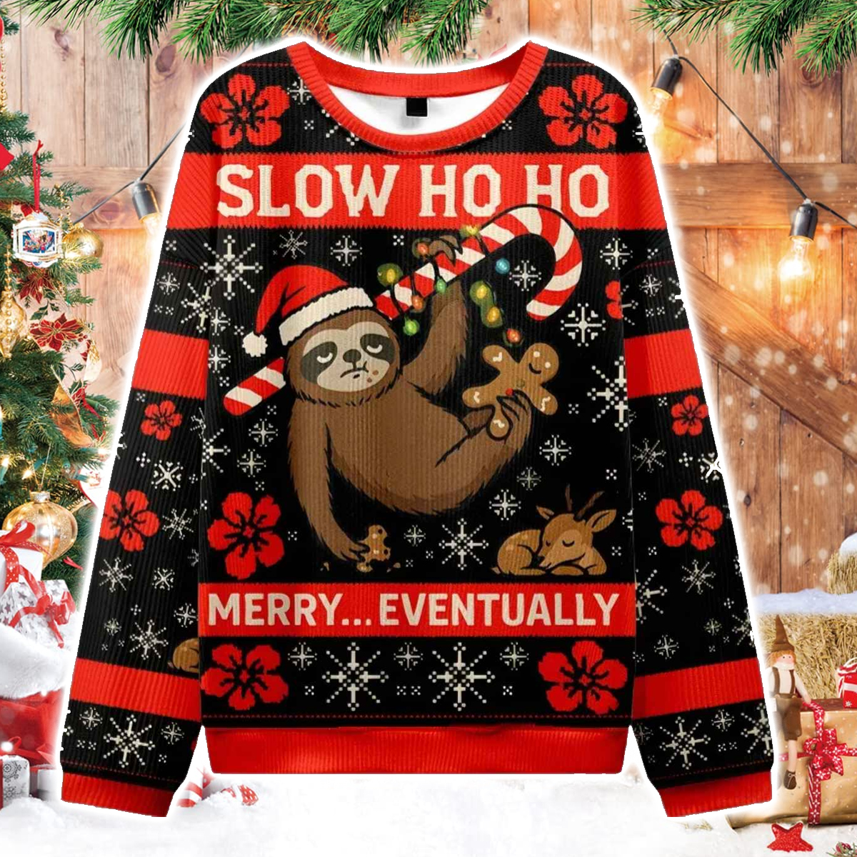 The design is bold, colorful, and wonderfully playful. Front and center is a cheerful sloth wearing a Santa hat, hanging lazily from a giant candy cane wrapped in glowing holiday lights. In its paw is a gingerbread man, the delightful moment that inspired the sweater’s name. Surrounding the sloth are classic Christmas motifs including snowflakes, red floral patterns, tiny gingerbread crumbs, and even a cute sleeping reindeer at the bottom. At the top, the phrase “SLOW HO HO” sets the tone for the whole piece, while the line “MERRY… EVENTUALLY” across the bottom adds the perfect comedic finish. This design gained attention during recent holiday seasons as sloth-themed humor became a major trend, making it a favorite at ugly sweater contests and Christmas gatherings.
