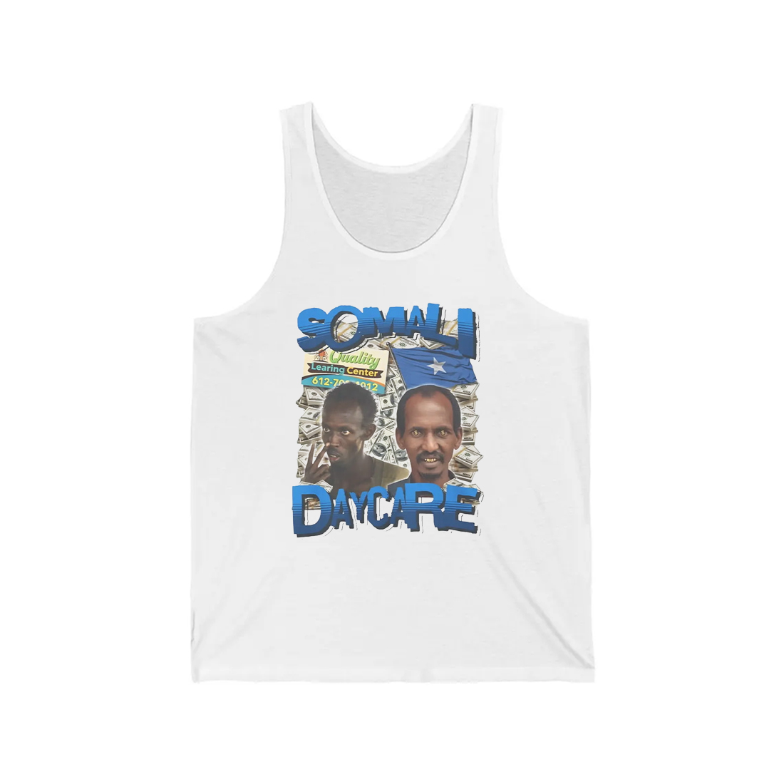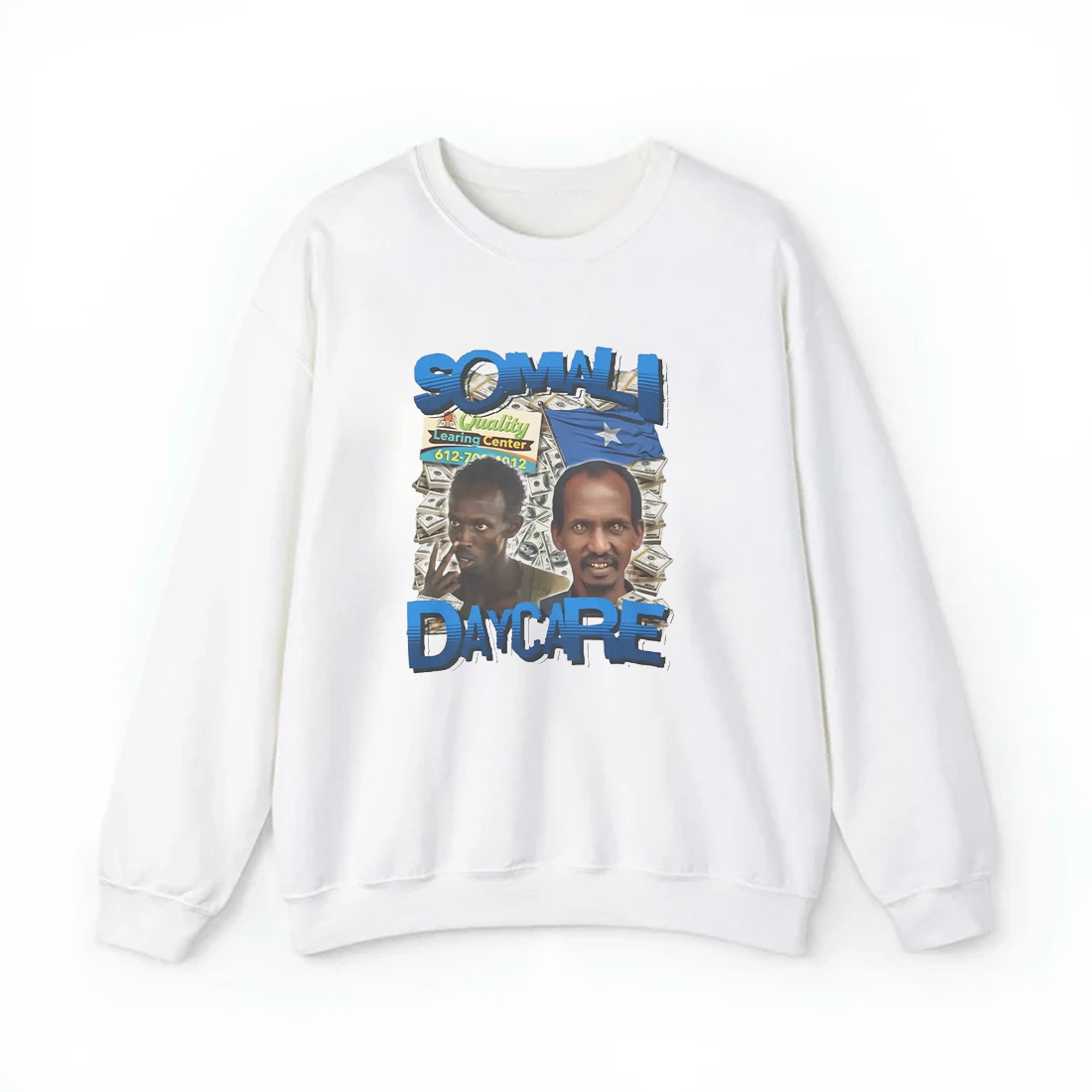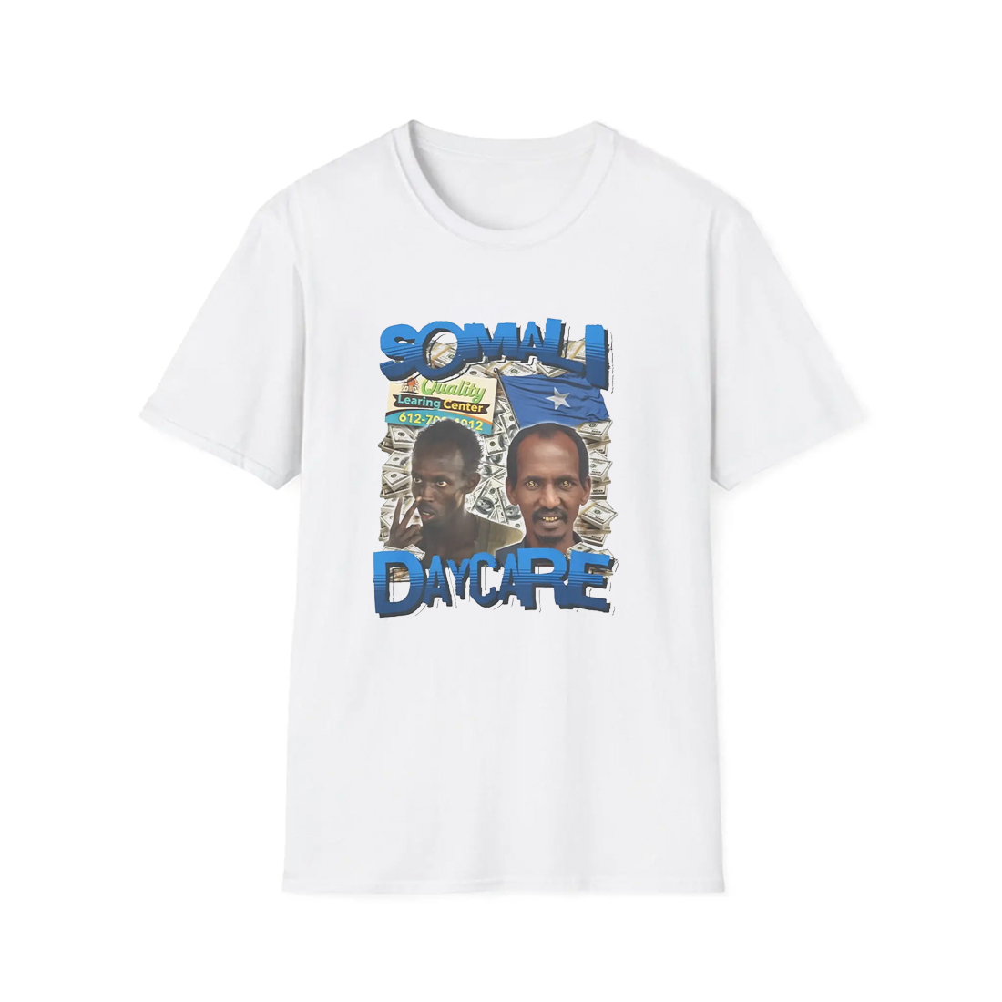 The Somali Daycare Quality Learning Center Shirt features a striking front graphic with two vivid portraits, layered over a background of dollar bills, a Somali flag, and a playful reference to a “learning center.” Printed on a crisp white shirt, this design turns heads and starts conversations. The vibrant blue lettering of “Somali Daycare” adds contrast and energy to the overall look. Made with soft, breathable cotton, this tee ensures comfort while you showcase your unique style. Whether you’re wearing it for laughs, to rep your roots, or simply to stand out, this shirt delivers both personality and quality.