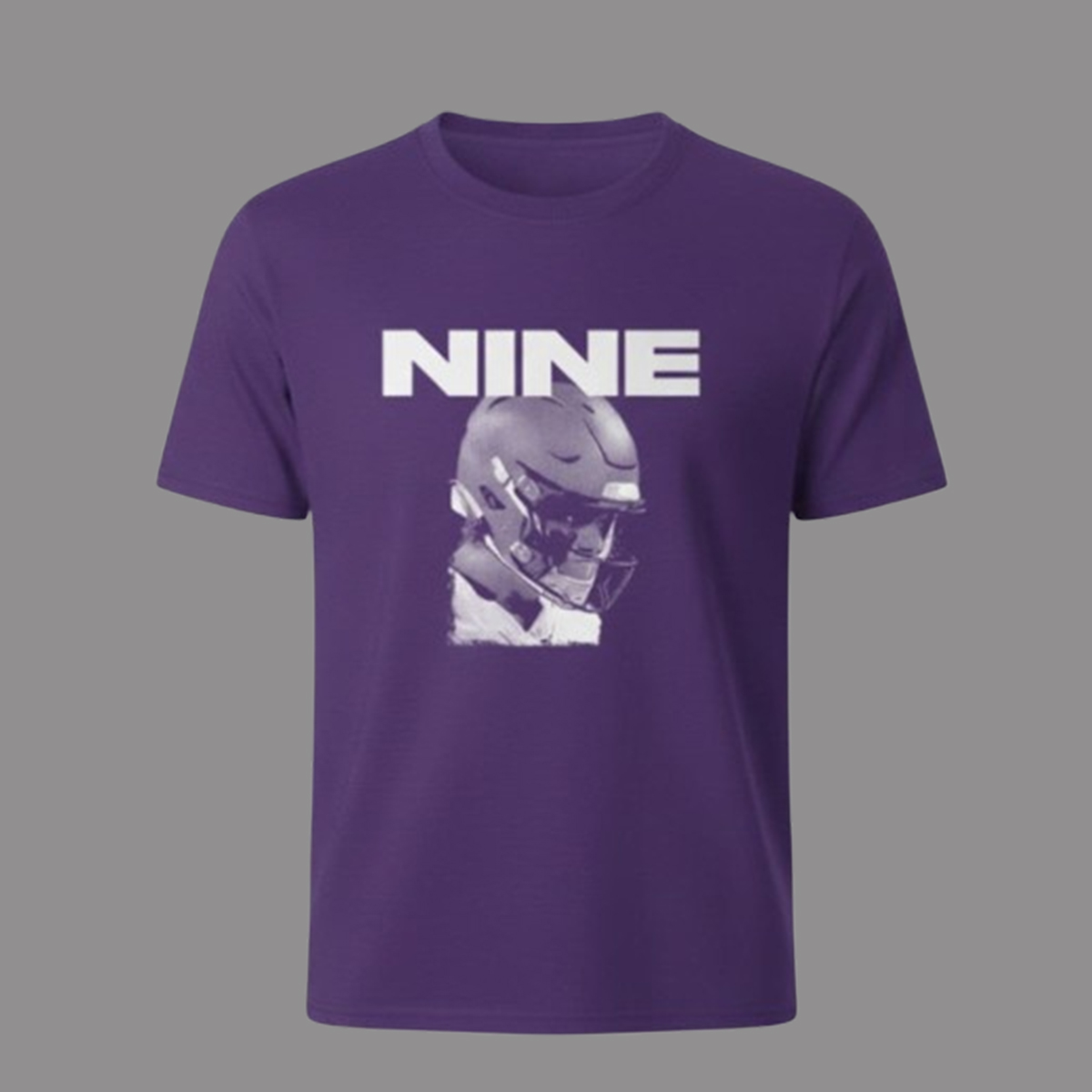 This shirt features a deep purple base that immediately stands out while maintaining a refined, wearable tone. Centered on the chest is a sharp, grayscale portrait-style graphic of a helmeted quarterback in profile, paired with the bold word “NINE” above it. The typography is clean and commanding, allowing the number to carry weight without unnecessary distractions.